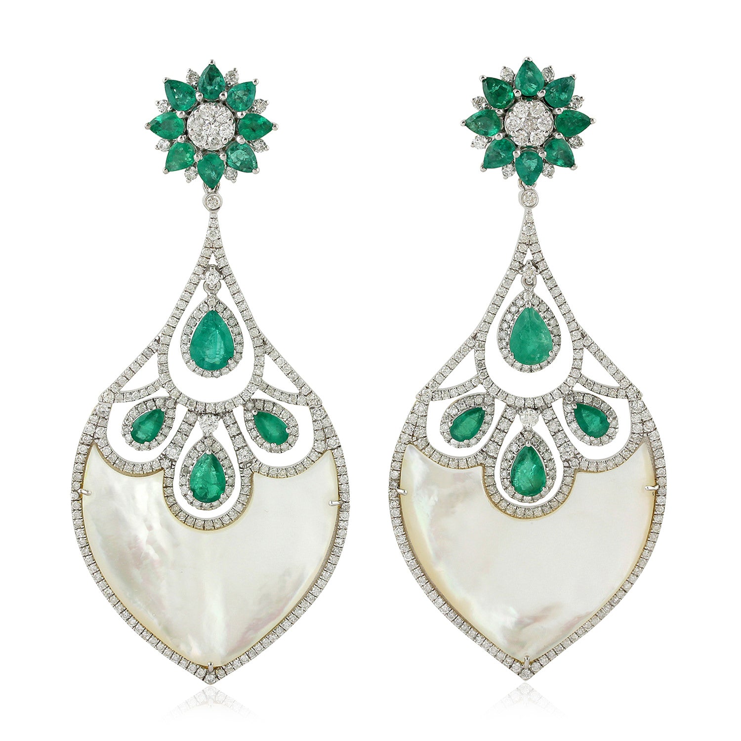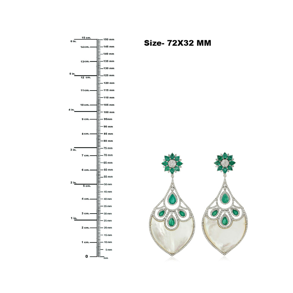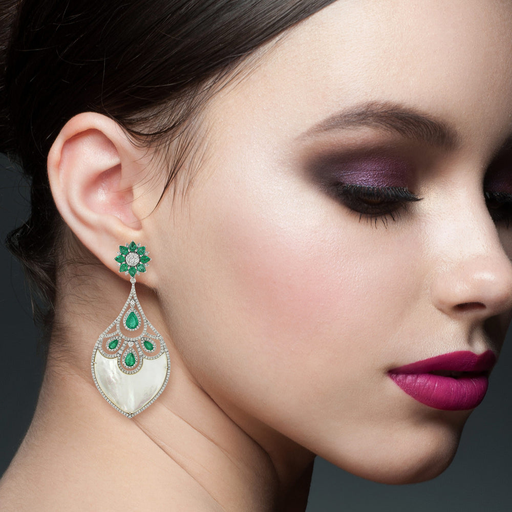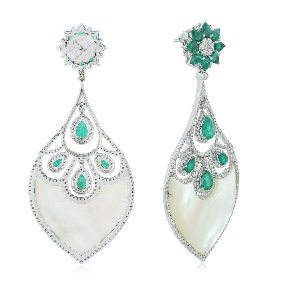 MOP Pear Cut Emerald Gemstone Pave Diamond Dangler In 18k White Gold
