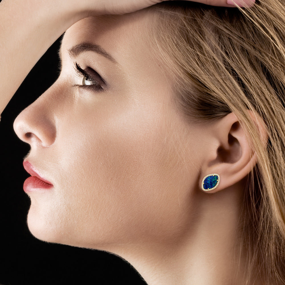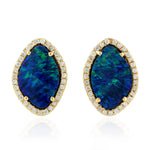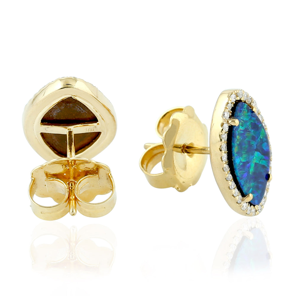 Natural Opal Doublet Prong Diamond Stud Earrings 18K Yellow Gold For Her