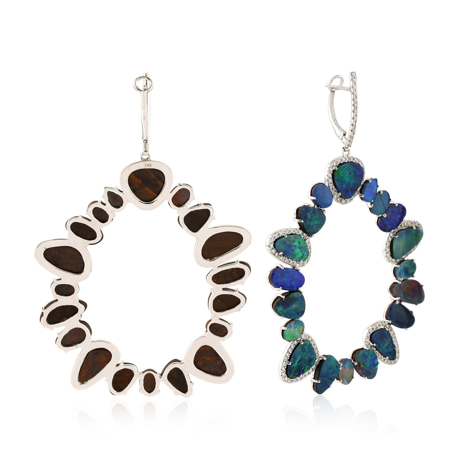 Oval Opal Doublet & Pave Diamond Hoop Earrings in 18K White Gold – October Birthstone