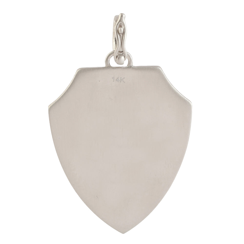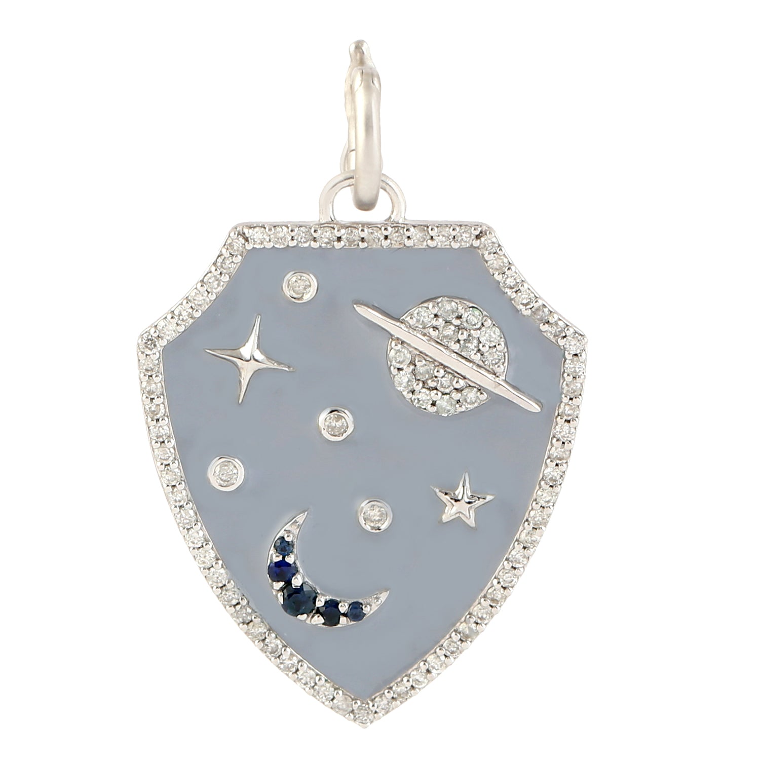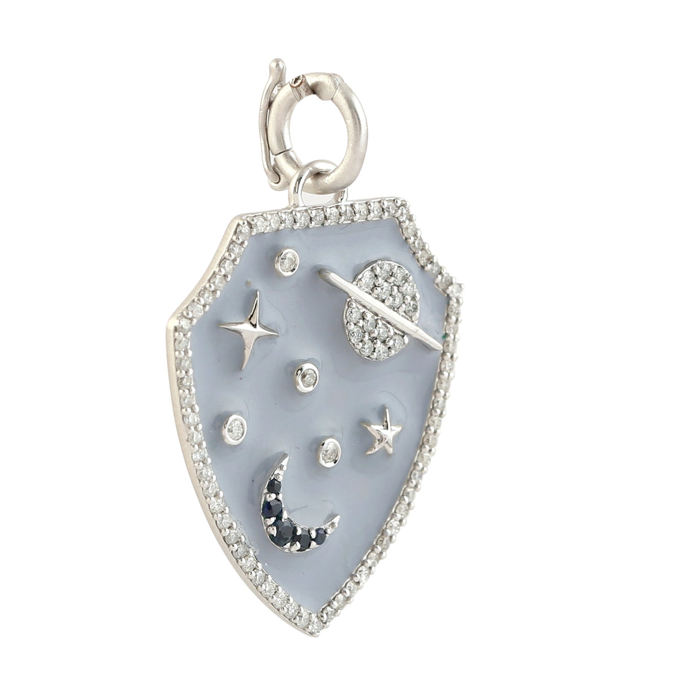 Blue Sapphire Diamond Crescent Moon, Star, and Planet Shield Pendant with Enamel