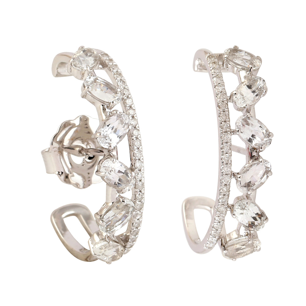 White Sapphire Gemstone Pave Diamond Hoop Earrings In Yellow And Gray Gold