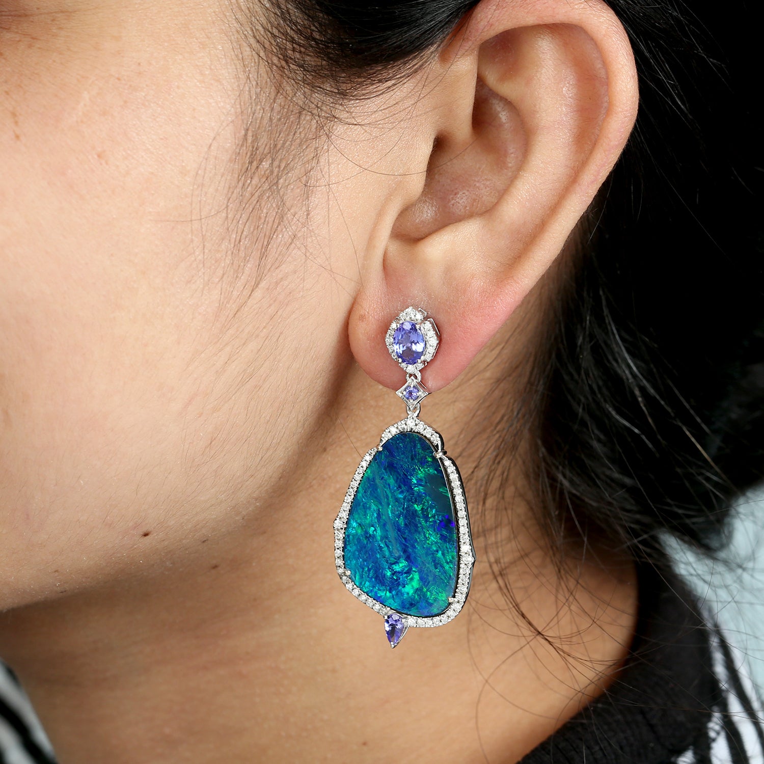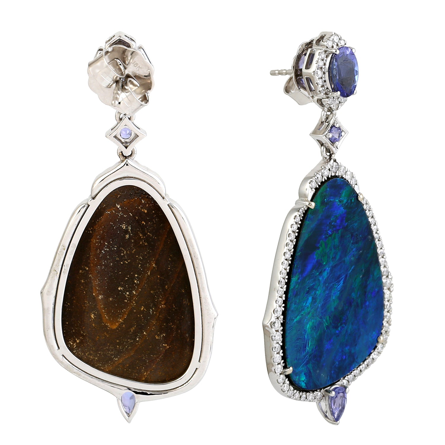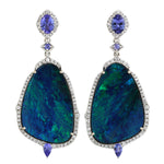 Opal Doublet Prong Tanzanite Gemstone Diamond Designer Danglers In White Gold