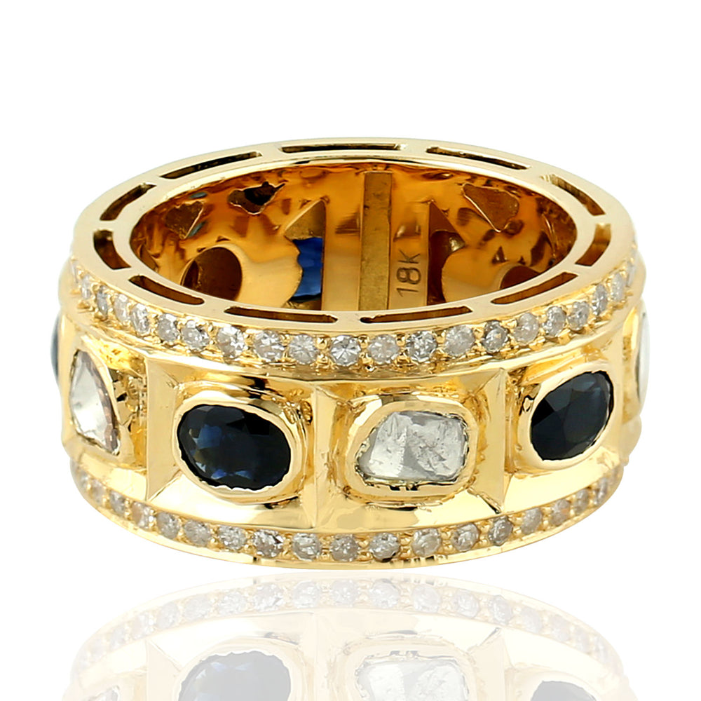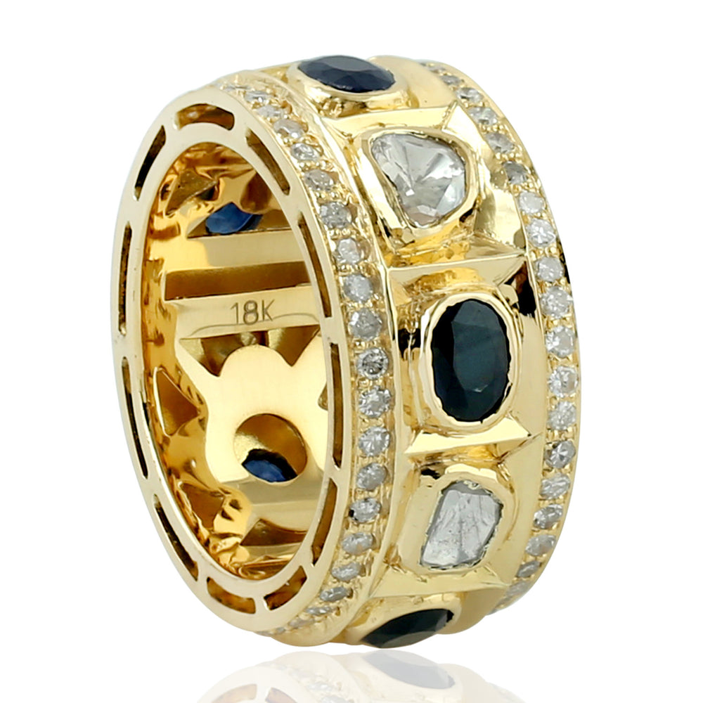 Natural Uncut Diamond Oval Blue Sapphire Bezel Set Band Ring 18K Yellow Gold Jewelry For Gift