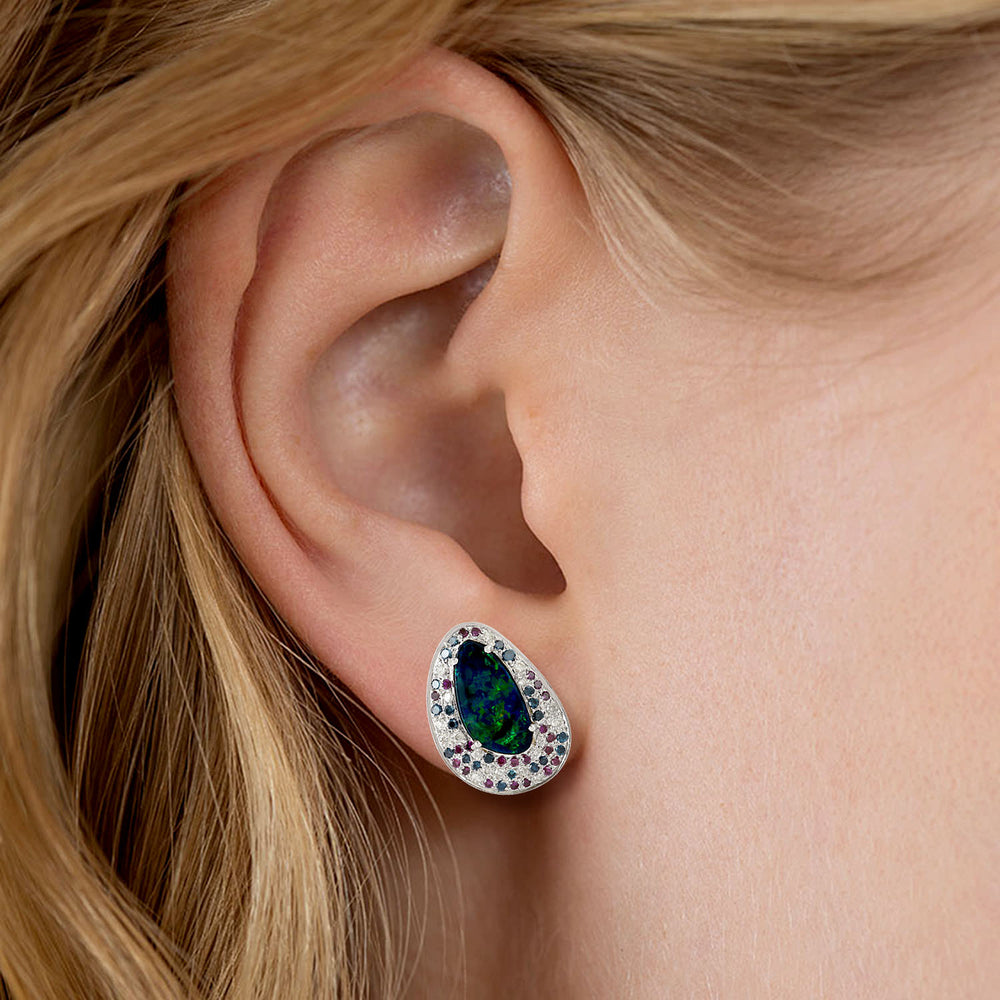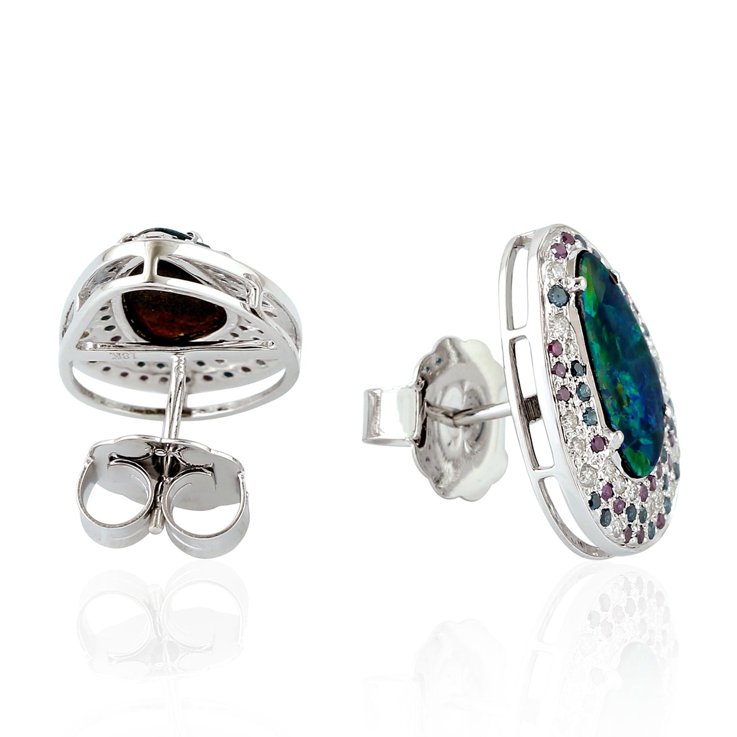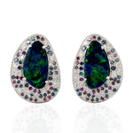 Opal Doublet Pave Colored Diamond In 18k White Gold Stud Earrings
