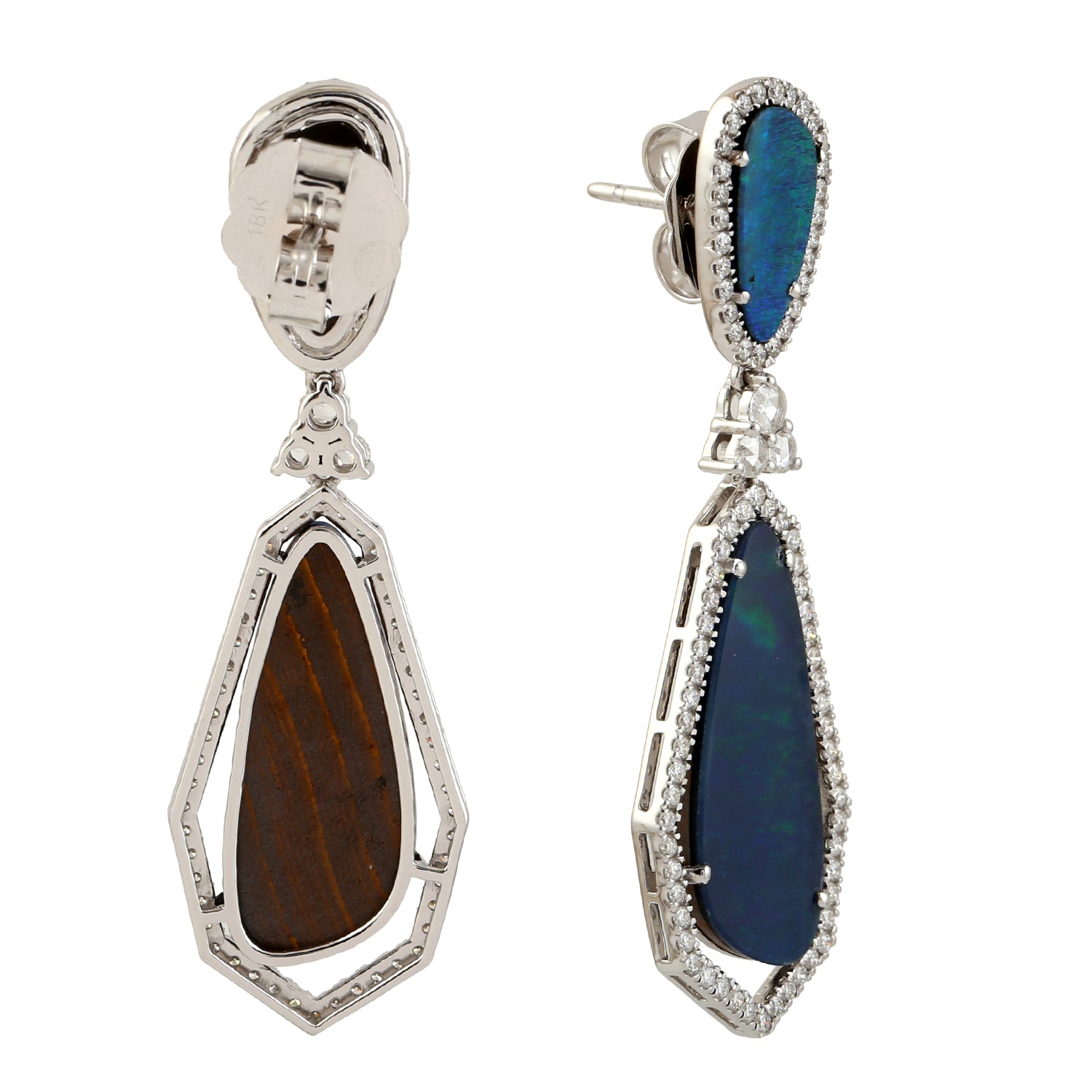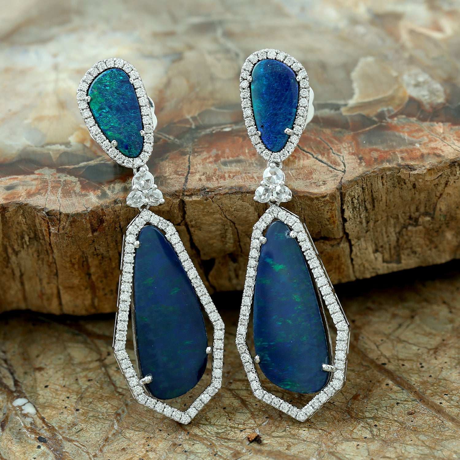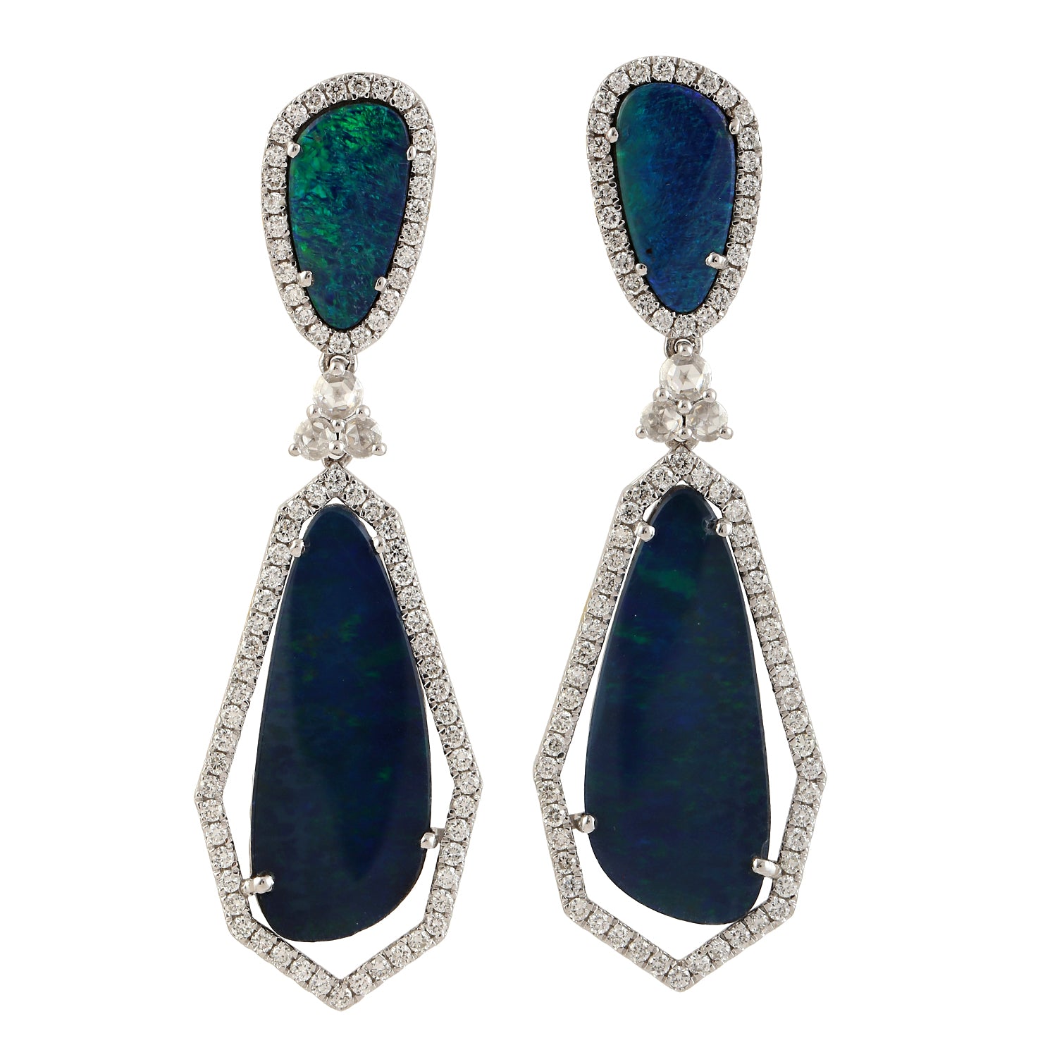 Opal Doublet Prong Rose Cut Diamond Dangle Earrings In White Gold October Birthstone