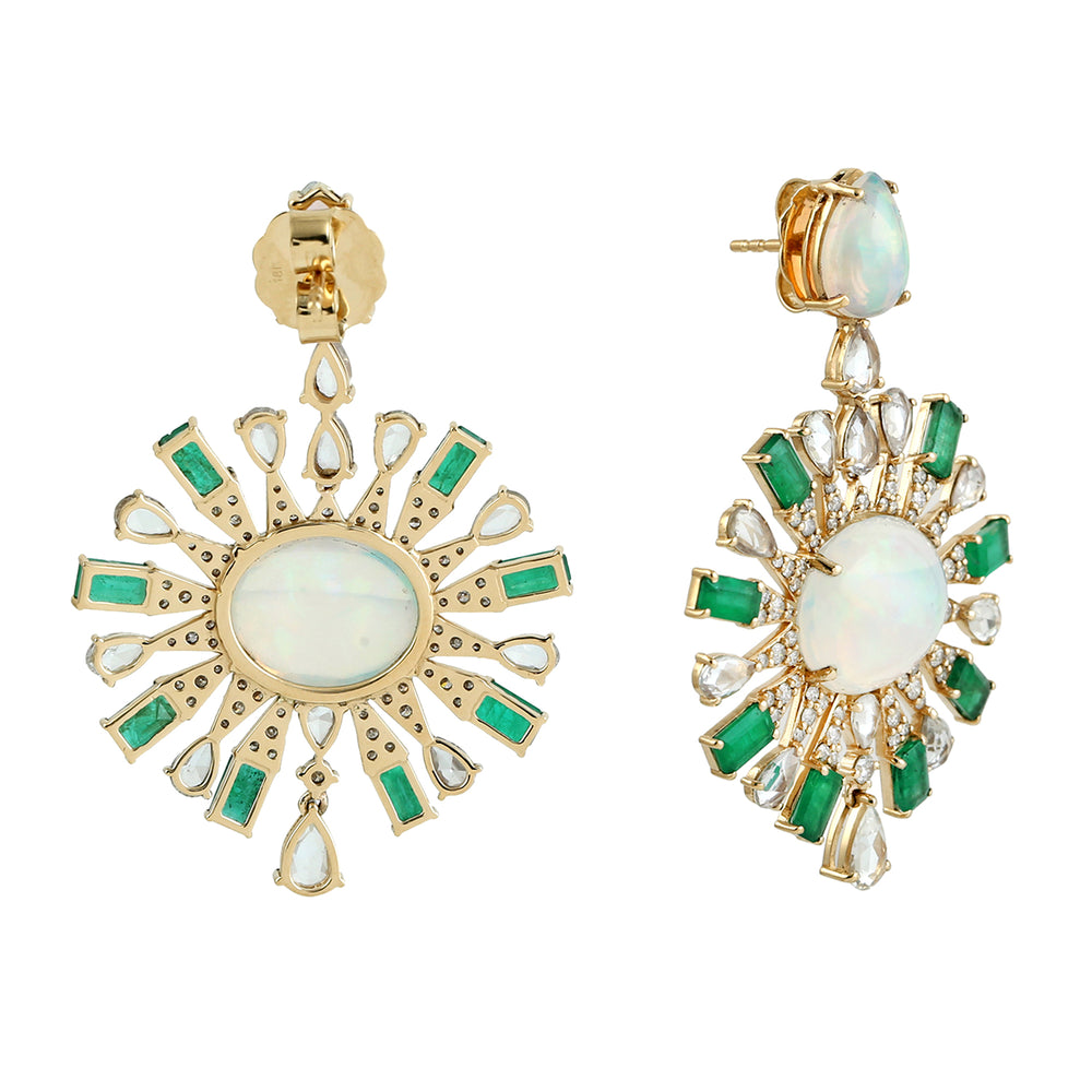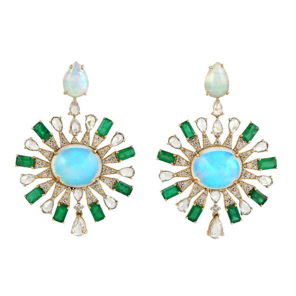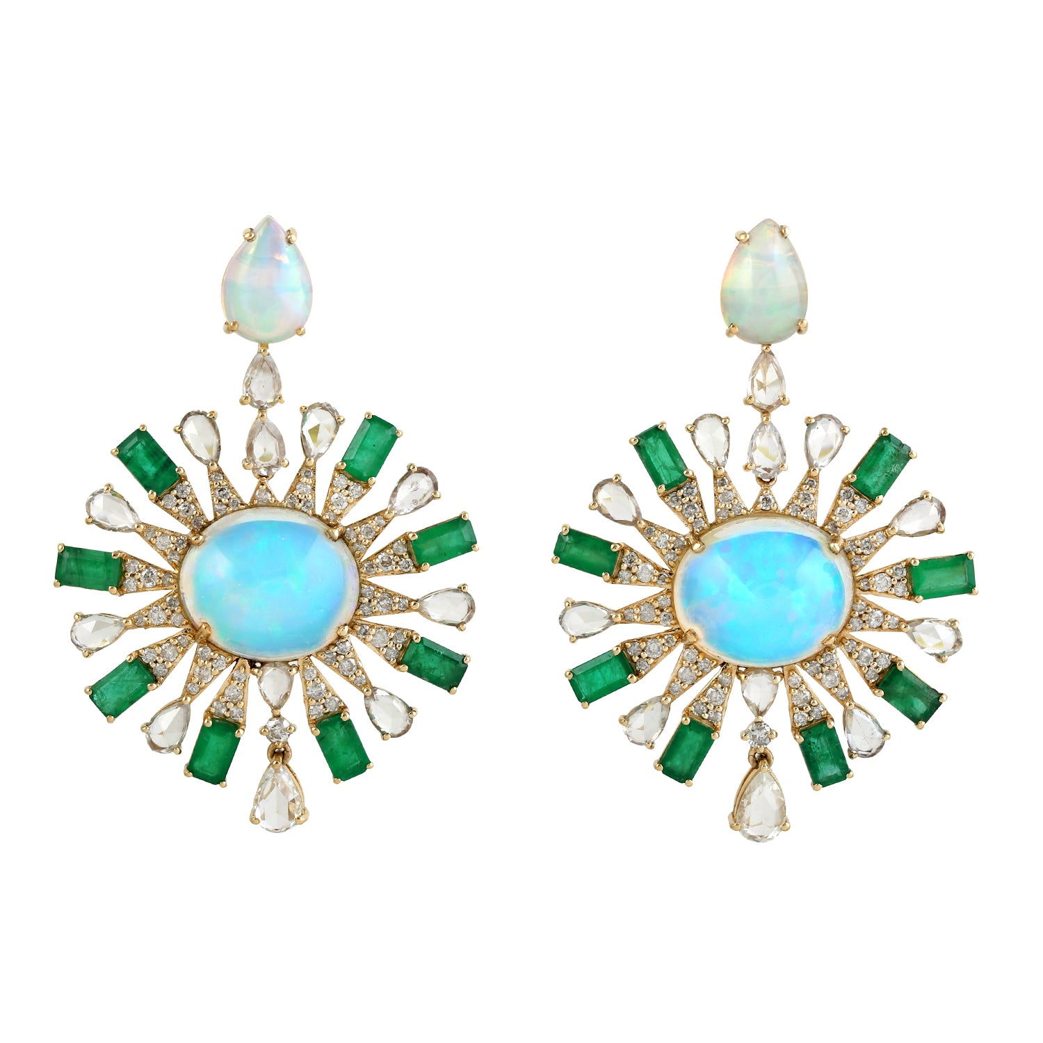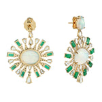 Opal Ethiopian Emerald Sapphire Gemstone Pave Diamond Sunburst In Gold Danglers