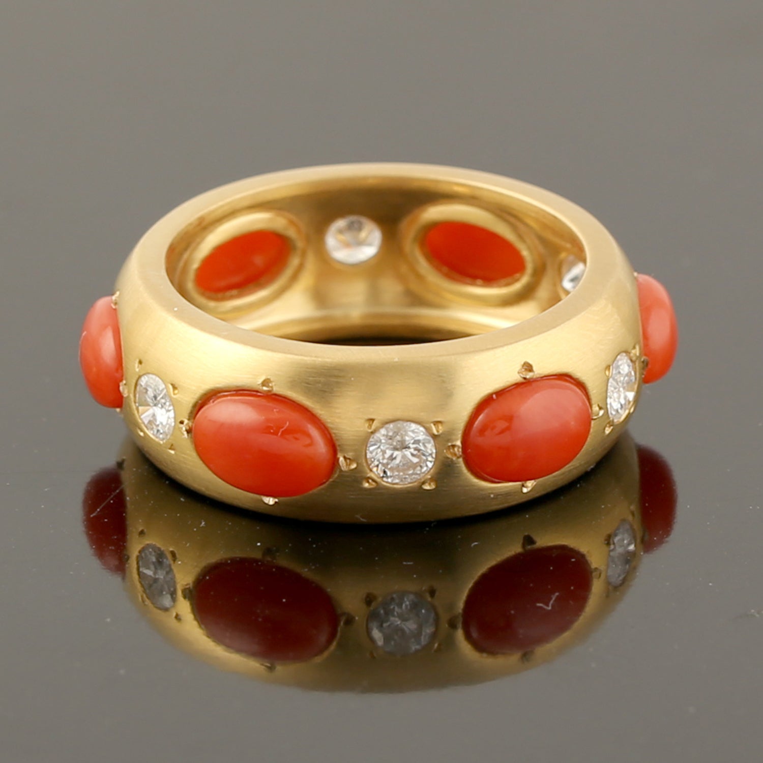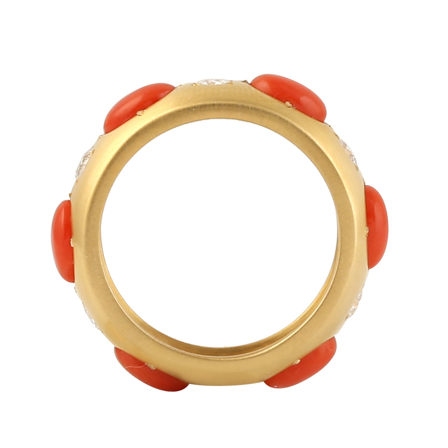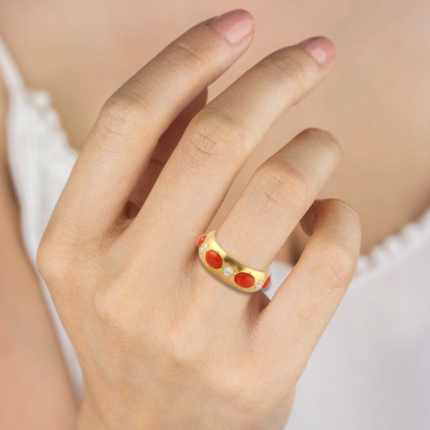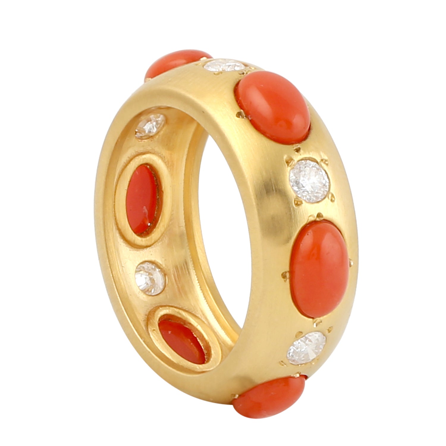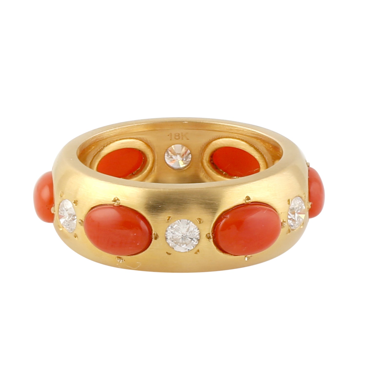 Oval Cut Coral Bezel Diamond Designer Band Ring In 18K Yellow Gold