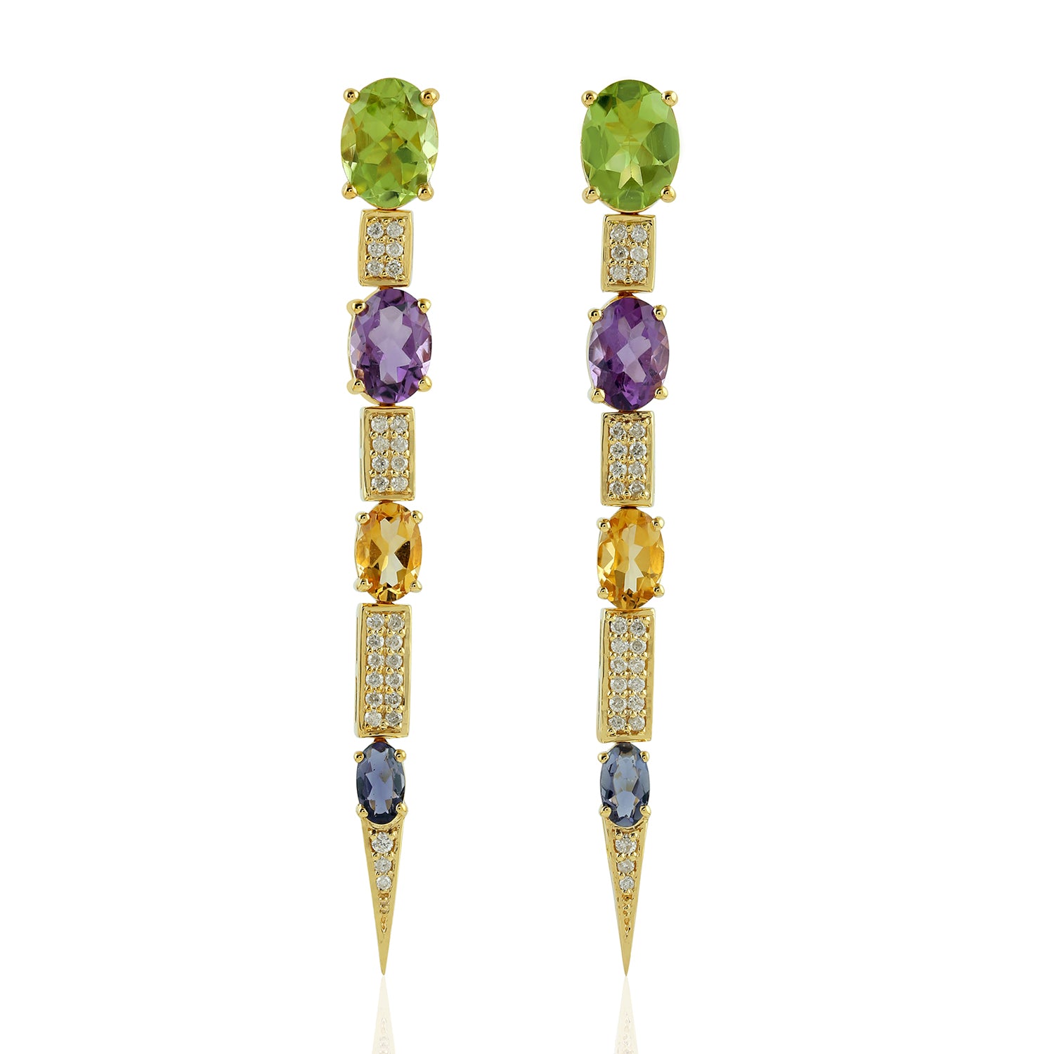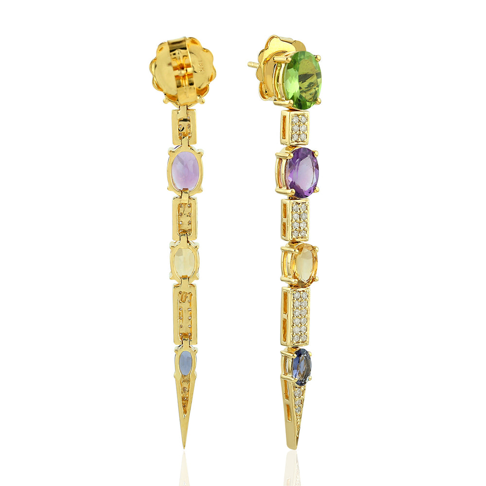 Oval Cut Peridot Prong Amethyst Multi Gemstone Pave Diamond Dangler In Gold