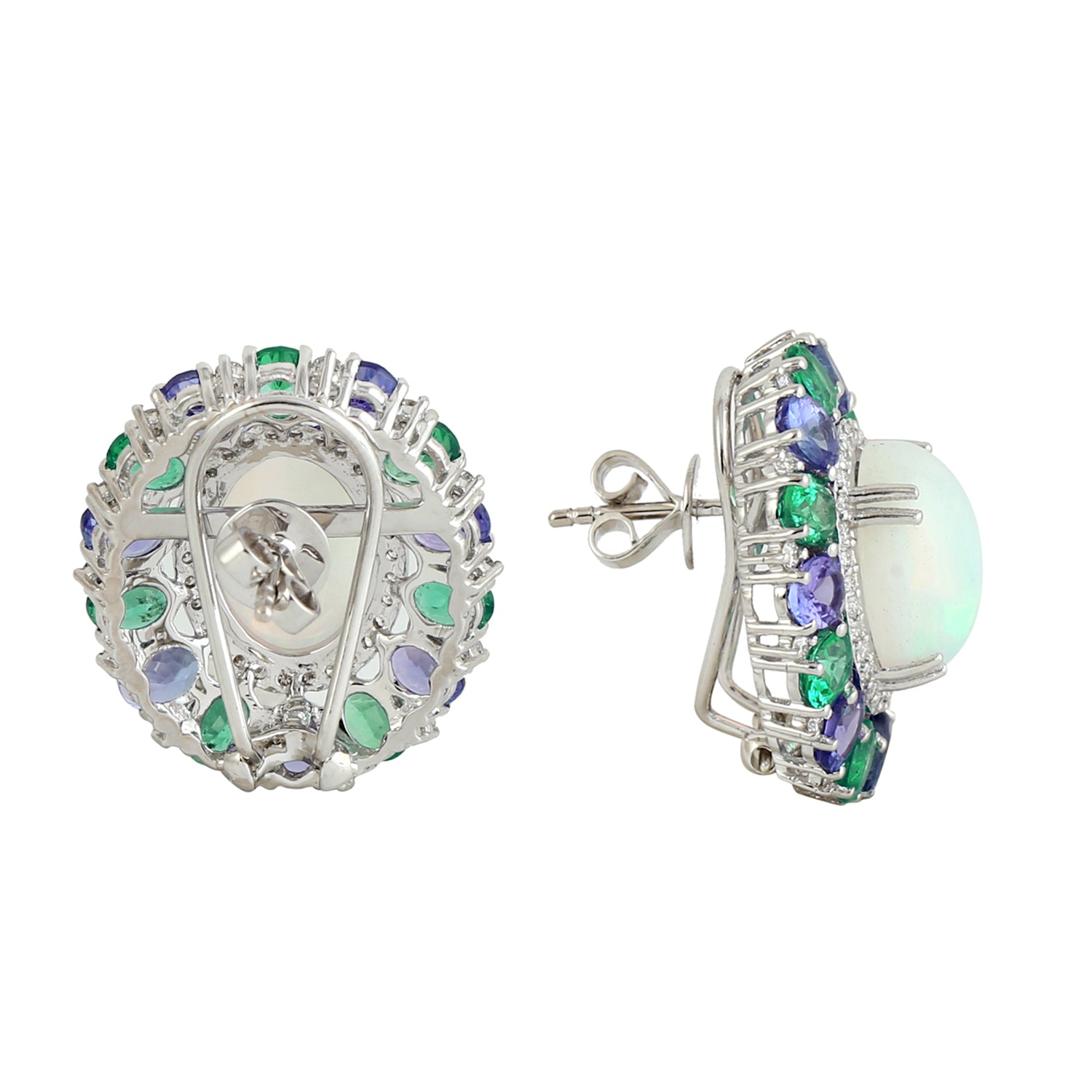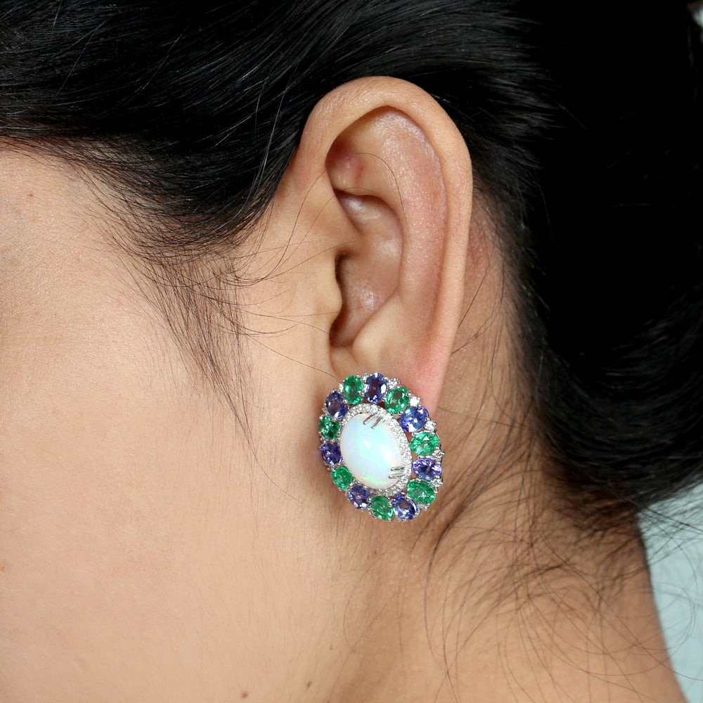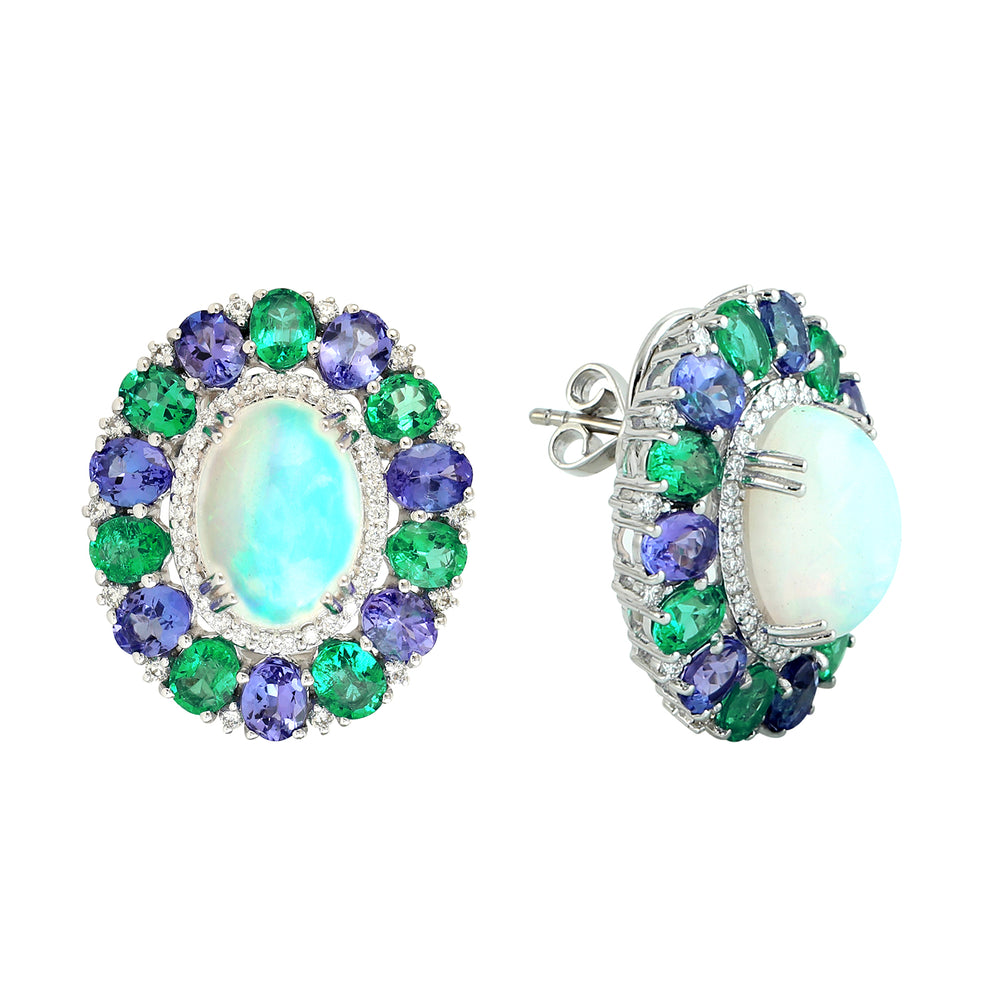 Opal Ethiopian Tanzanite Emerald Gemstone Pave Diamond Stud In White Gold