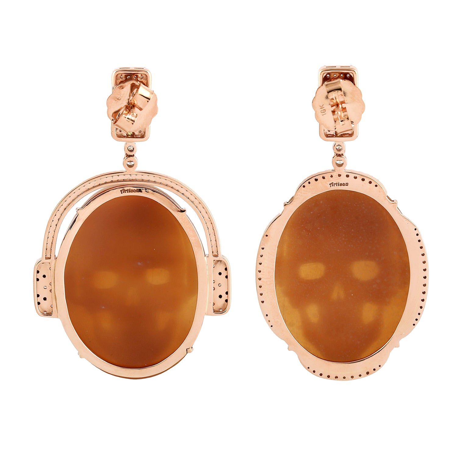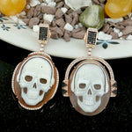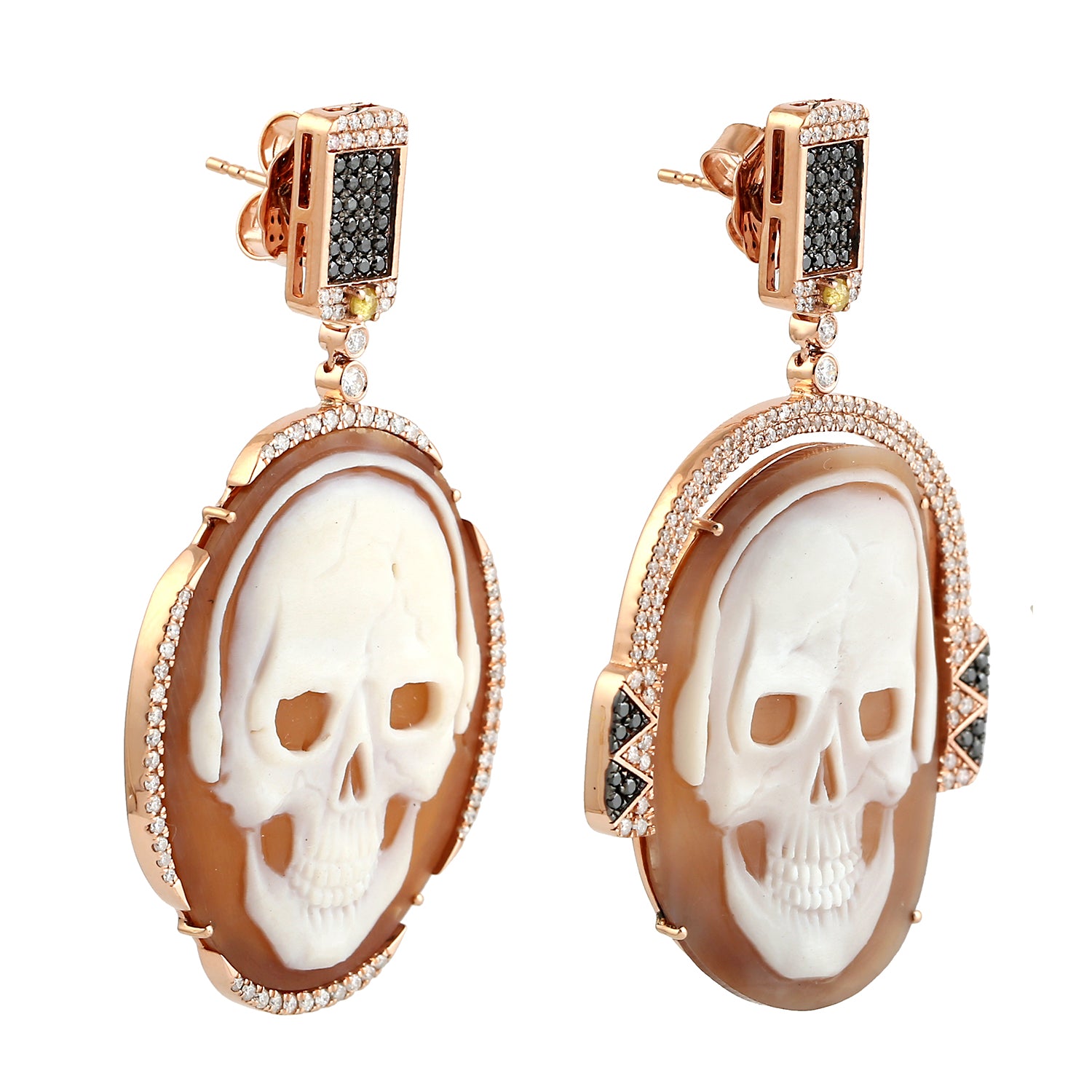 Shell Cameo Pave Black & White Diamond Skull Headphone Mismatch Danglers In Gold