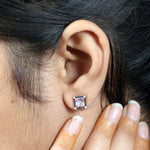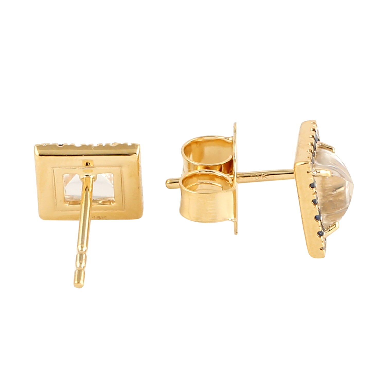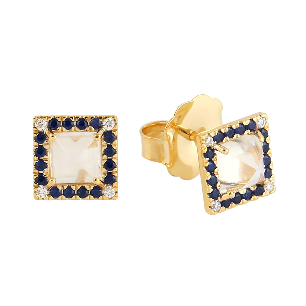18k Yellow Gold Square Moonstone Stud Earrings with Pave Blue Sapphires and Diamond