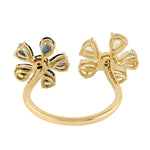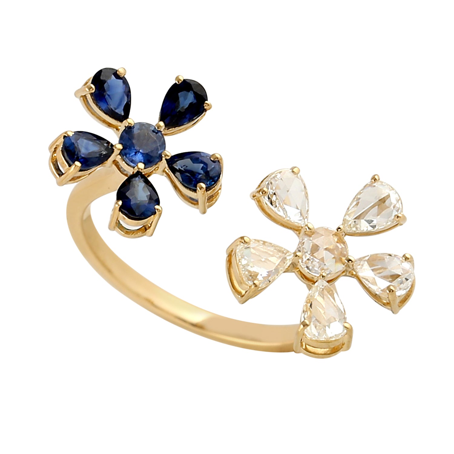 Pear Cut Blue Sapphire Rose Cut Diamond Bypass Ring In Yellow Gold