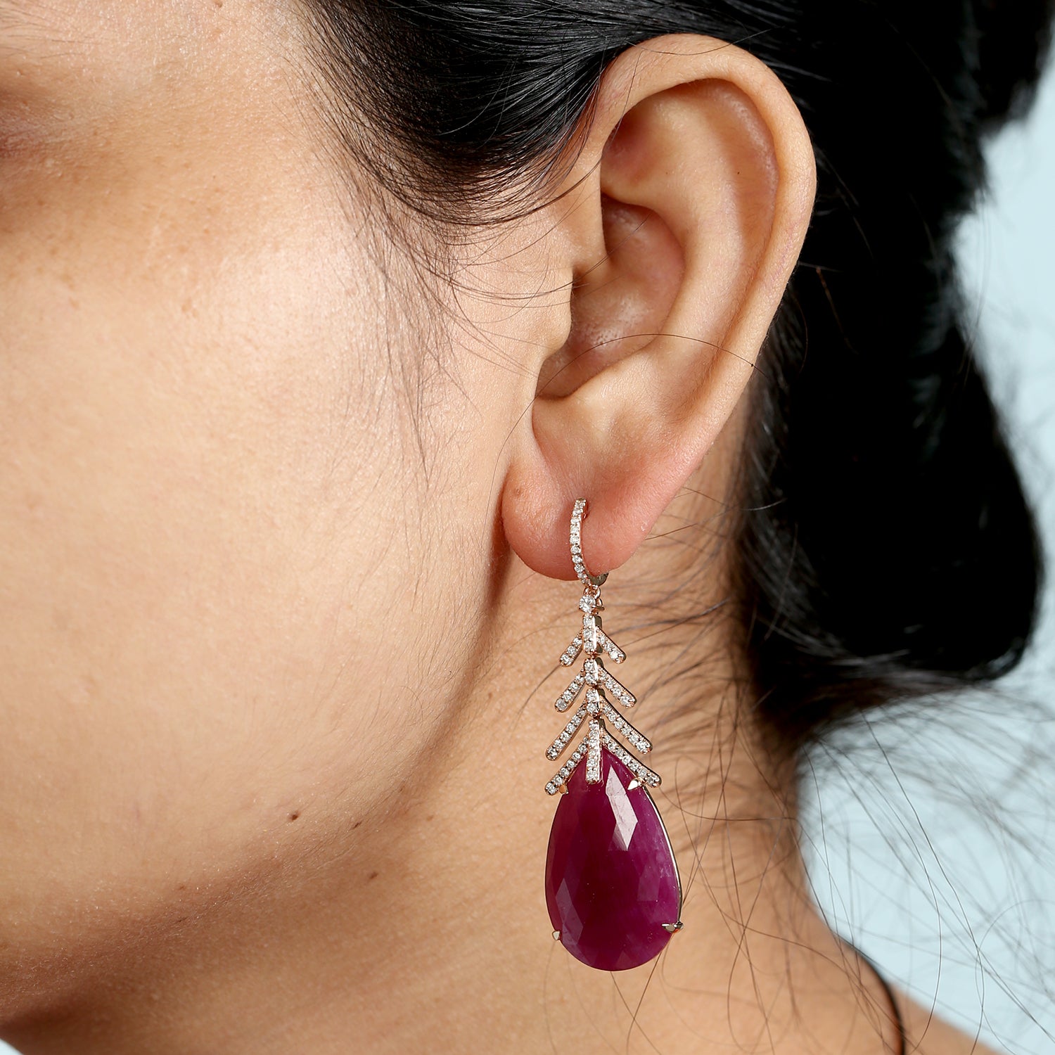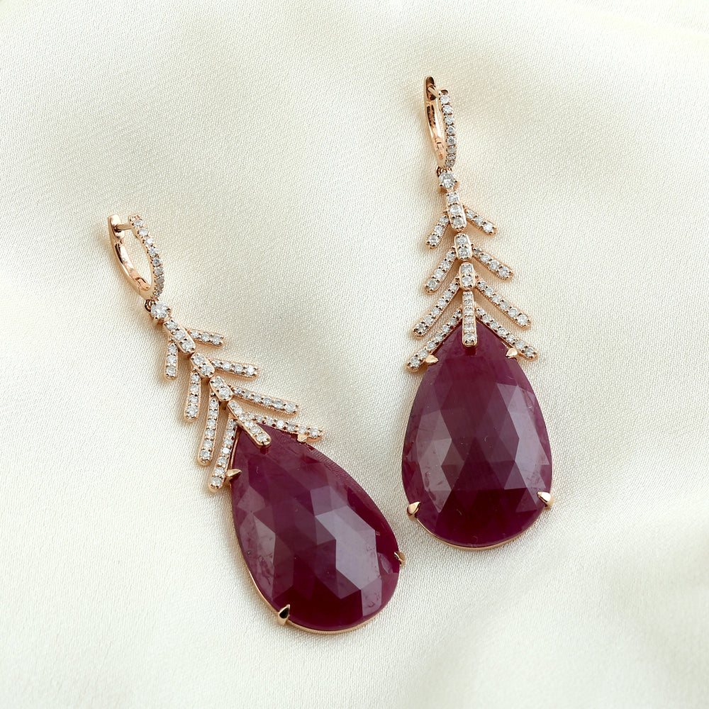 Pear Cut Ruby Gemstone Pave Diamond Leaf Design Danglers In 18k Rose Gold