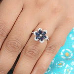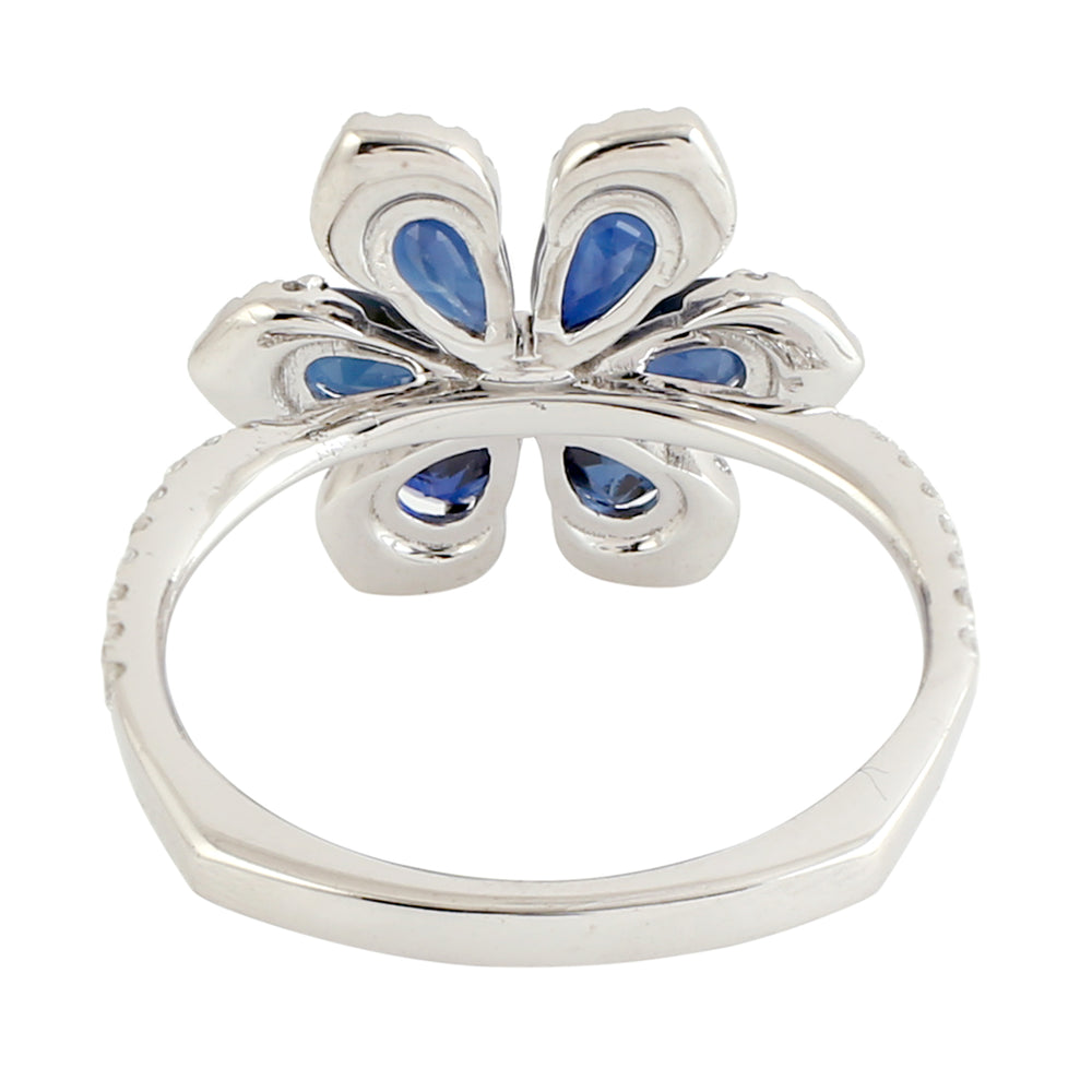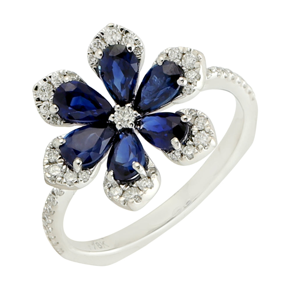 Pear Cut Blue Sapphire & Pave Diamond Daisy Floral Ring in 18K White Gold – Elegant Designer Jewelry for Her