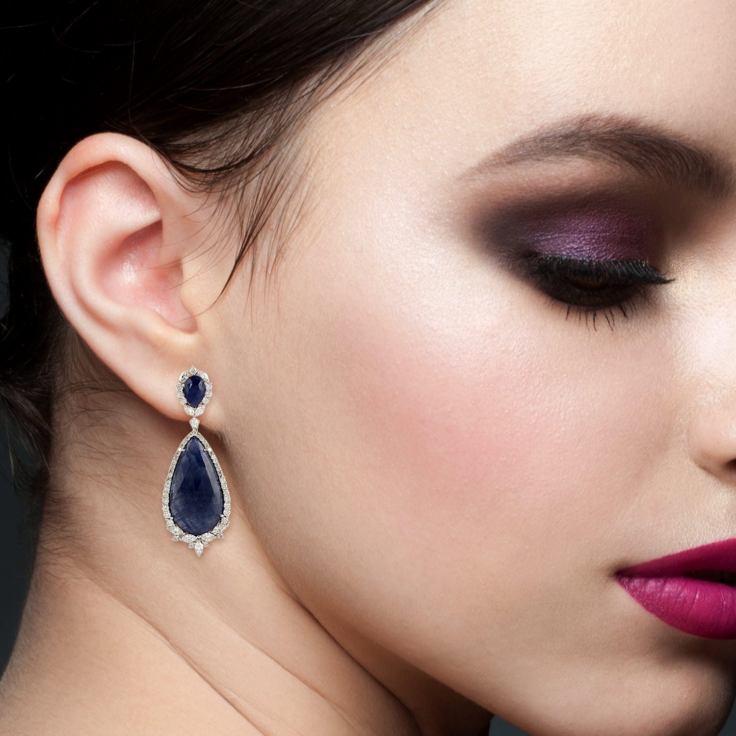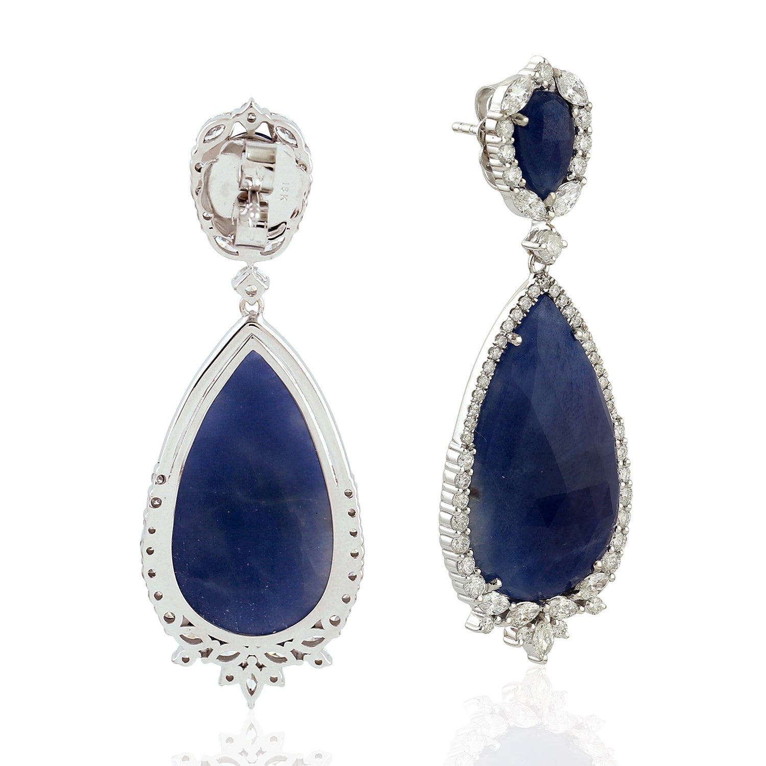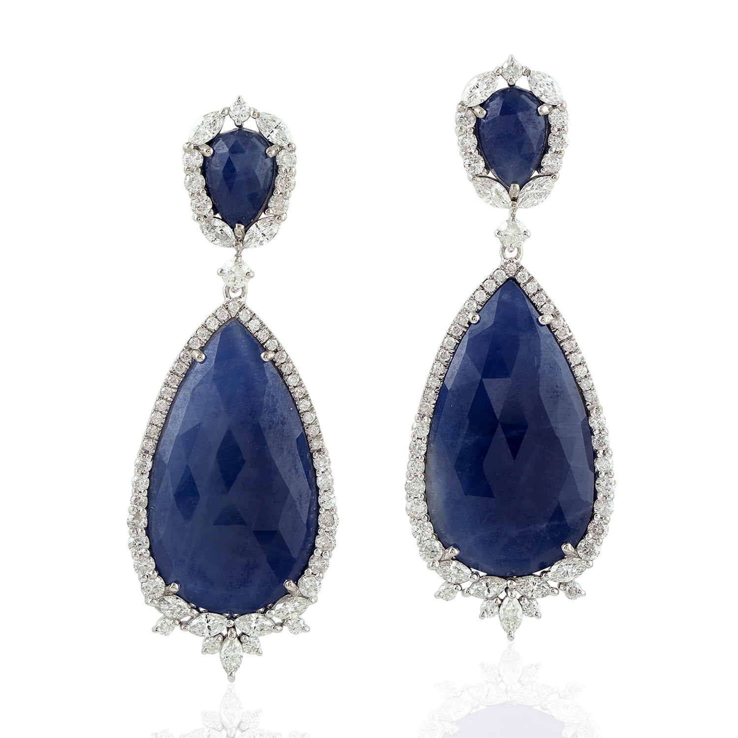 Pear Cut Blue Sapphire Rose Cut Diamond Tear Drop Danglers In 18k White Gold