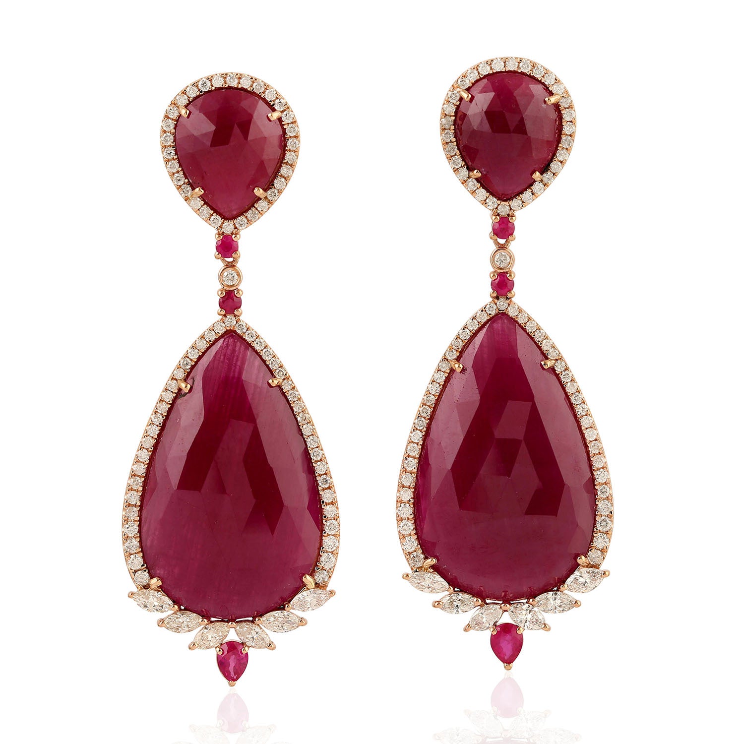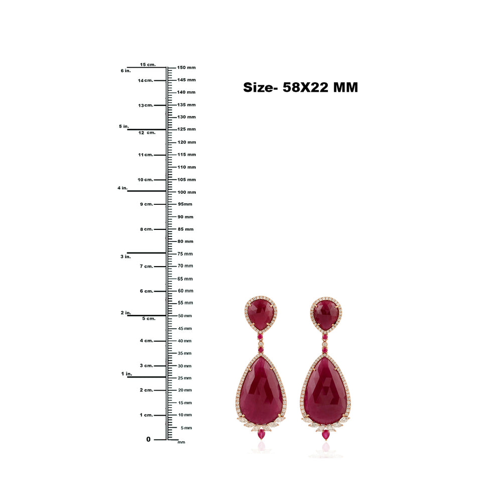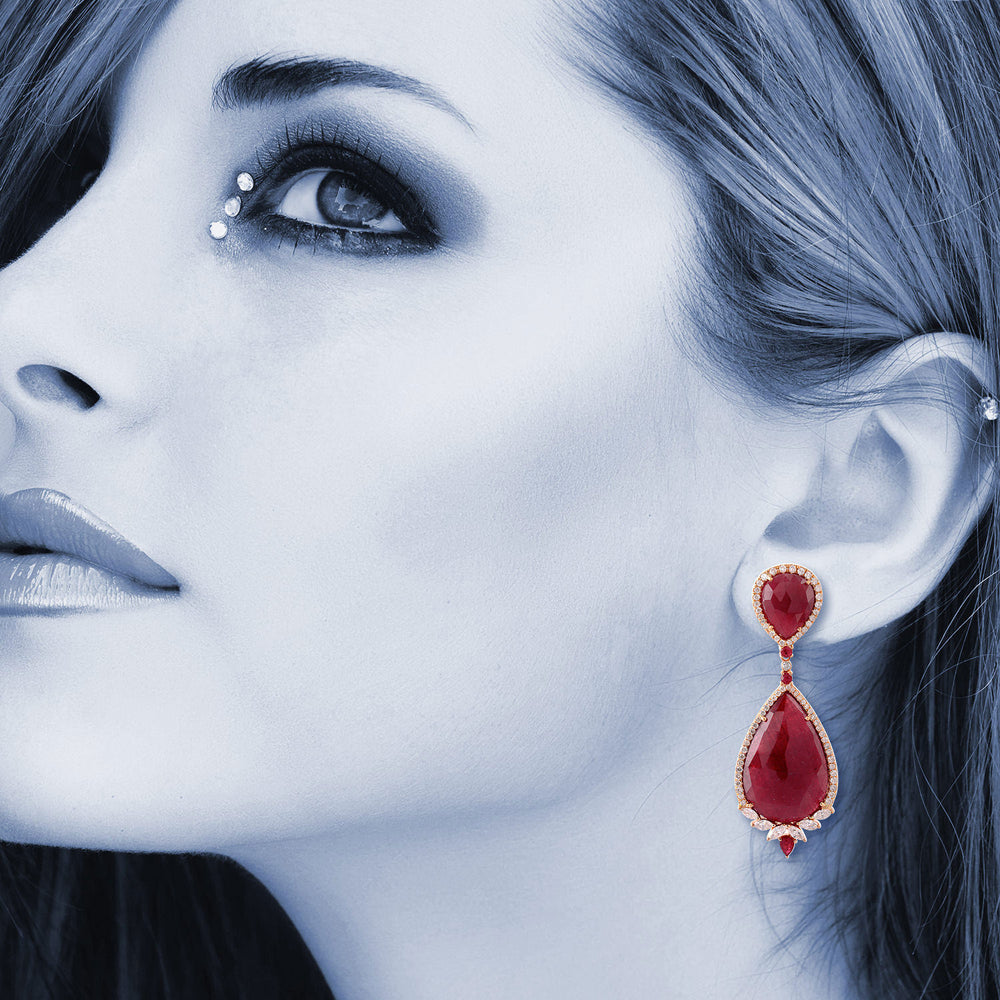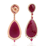 Pear Ruby Gemstone Rose Cut Diamond Dangle Earrings In 18k Rose Gold