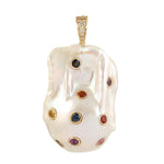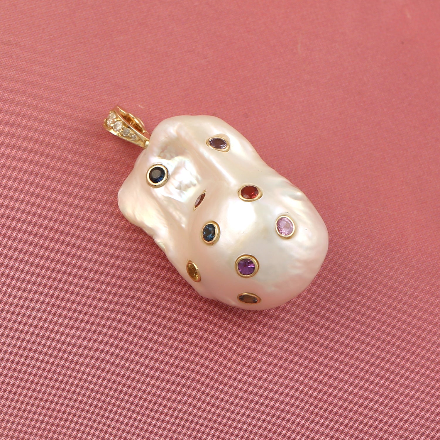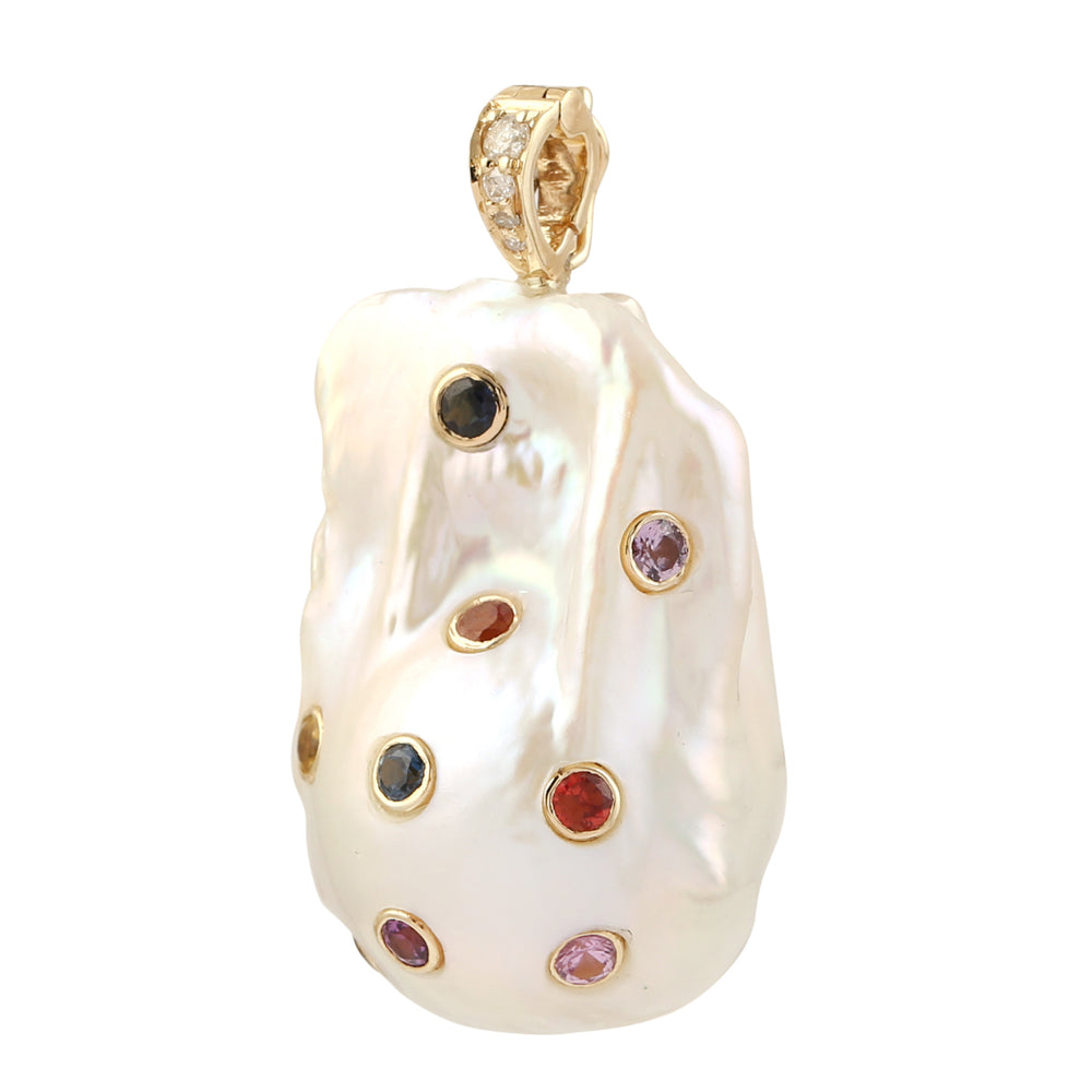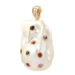 Pearl Chinese Bezel Multi Sapphire Pave Diamond Pendant In 14k Yellow Gold