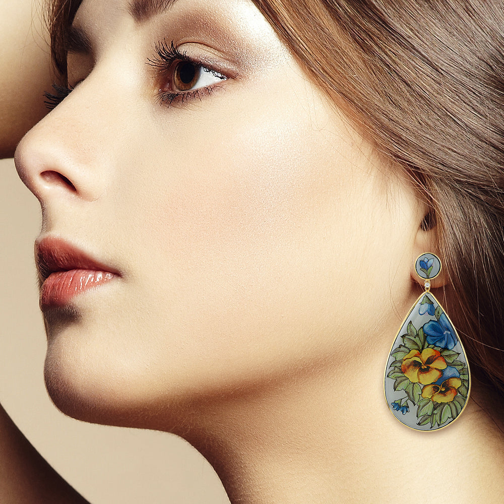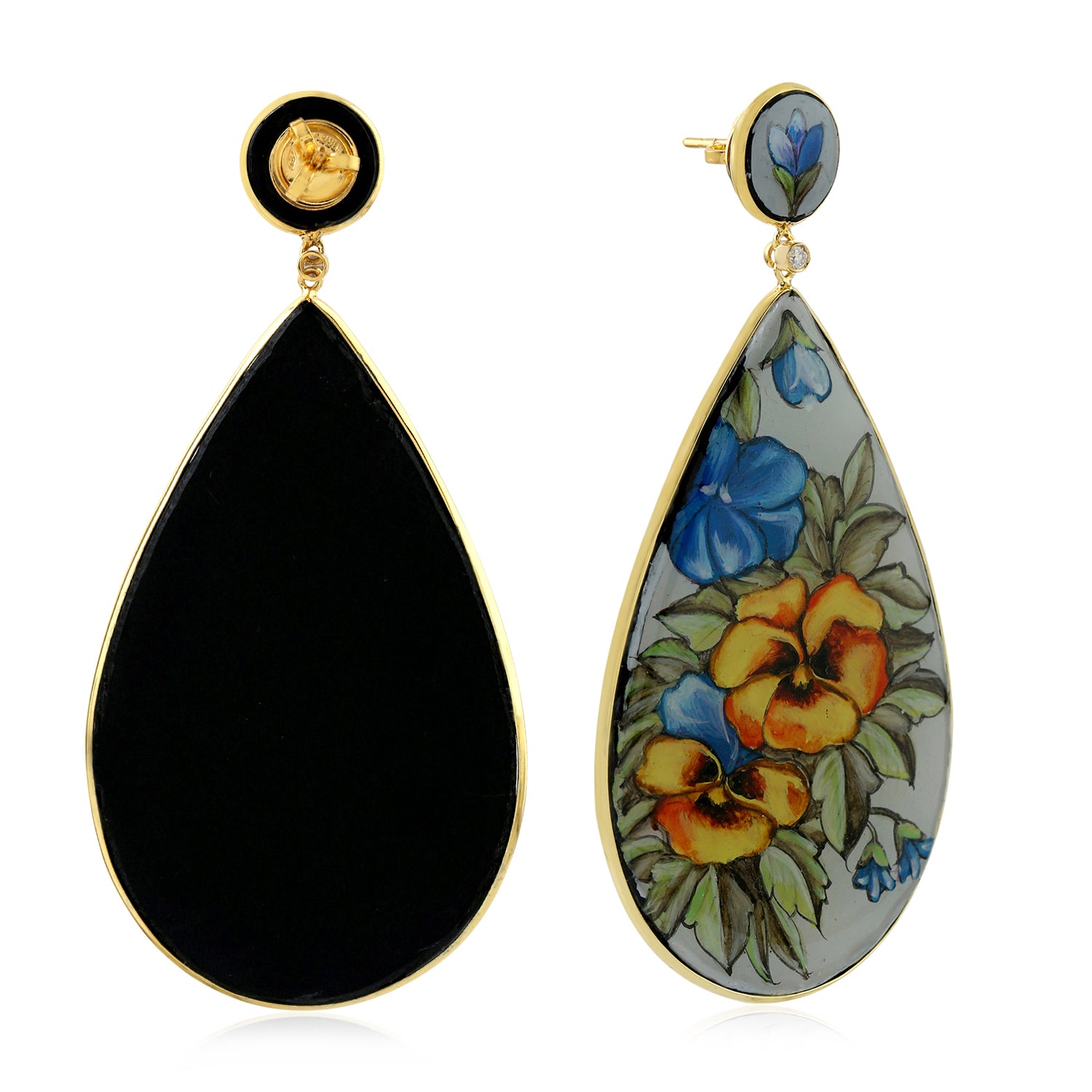 Picture Bakelite Gold Prong Diamond Flower Enamel Dangler In 18K Yellow Gold