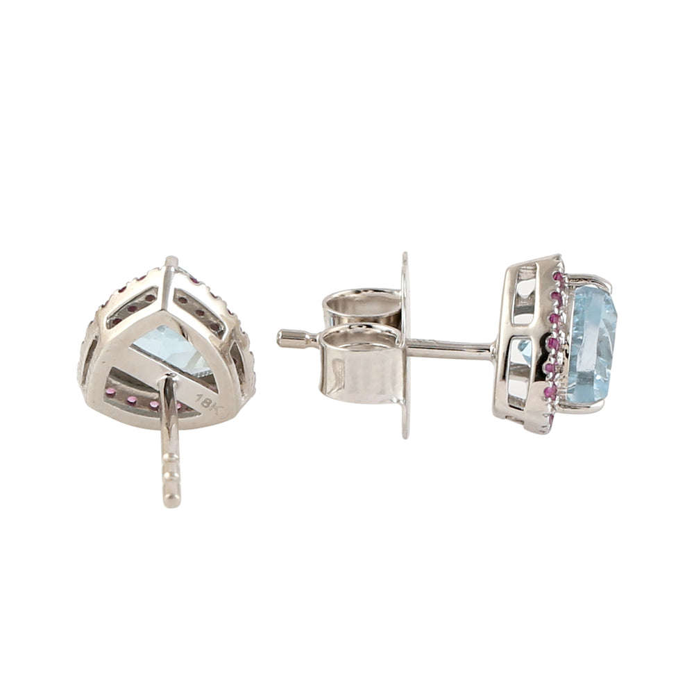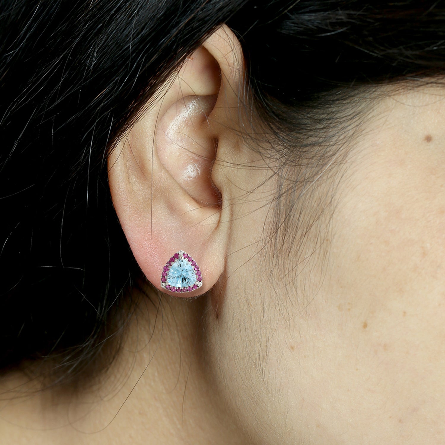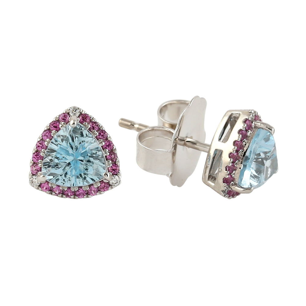 White Gold Trillion Pink Sapphire & Blue Topaz Stud Earrings with Prong Set Diamonds – Vibrant Fine Jewelry
