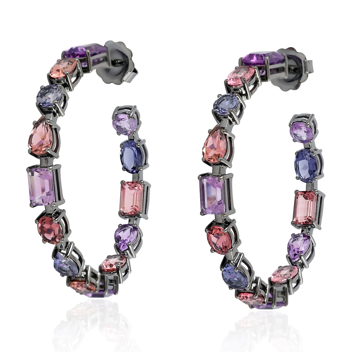 Pink Tourmaline Amethyst Iolite Gemstone Hoop Earrings In 18K White Gold