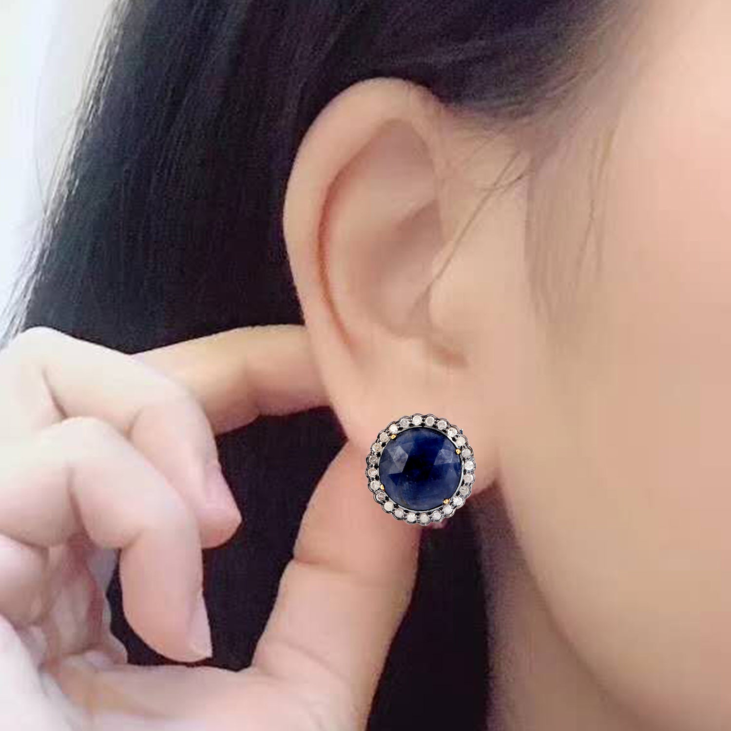 Prong Set Blue Sapphire Pave Diamond Round Stud Earrings in 18k Gold & Sterling Silver