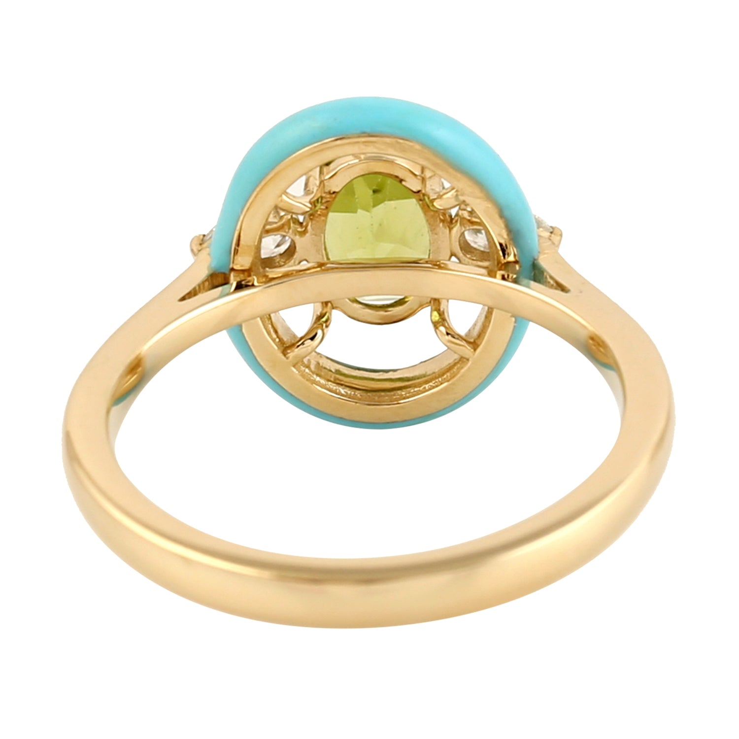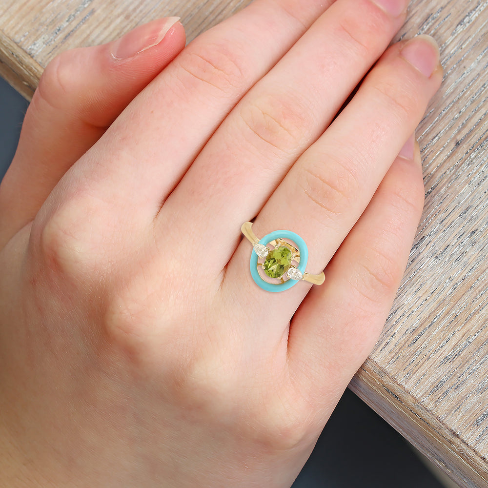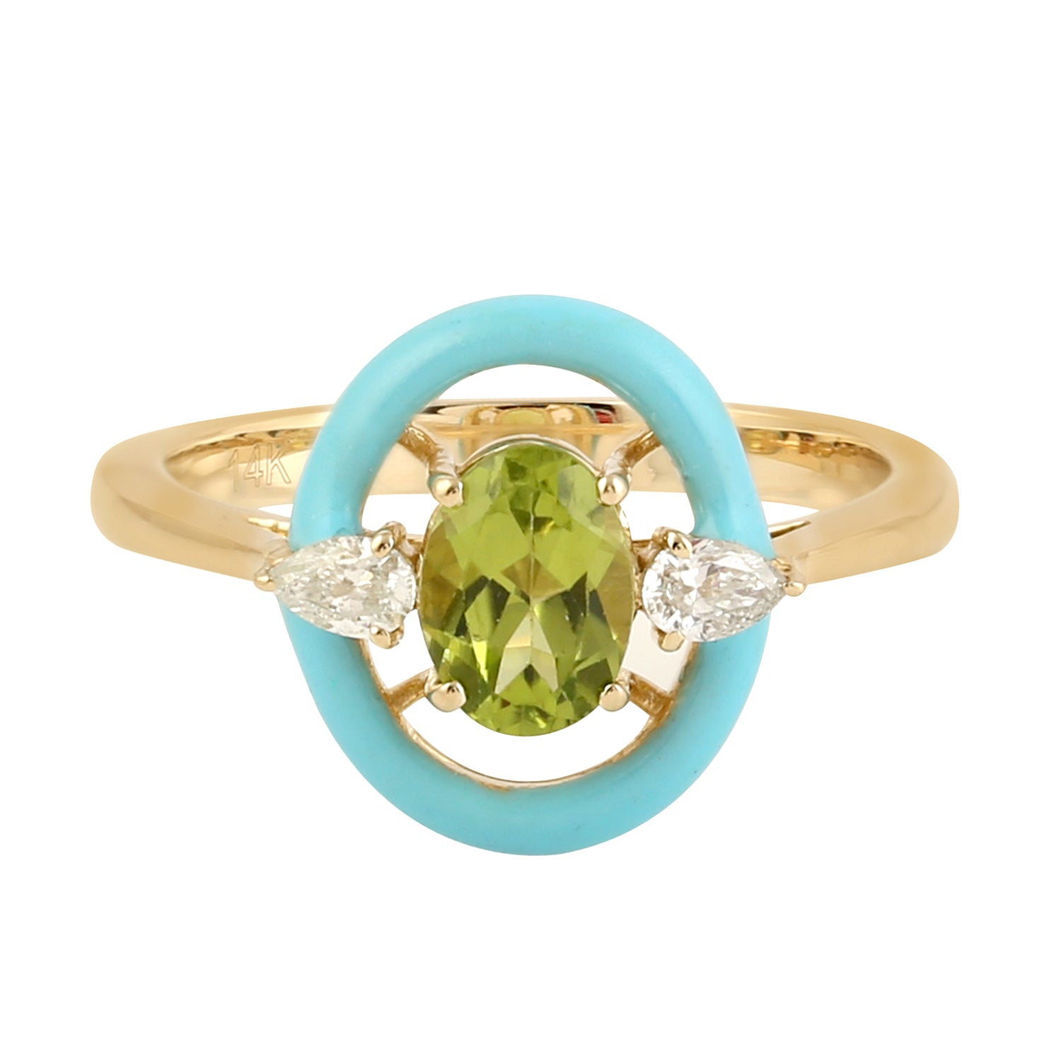 Oval Cut Peridot & Diamond Enamel Designer Ring In 14k Yellow Gold
