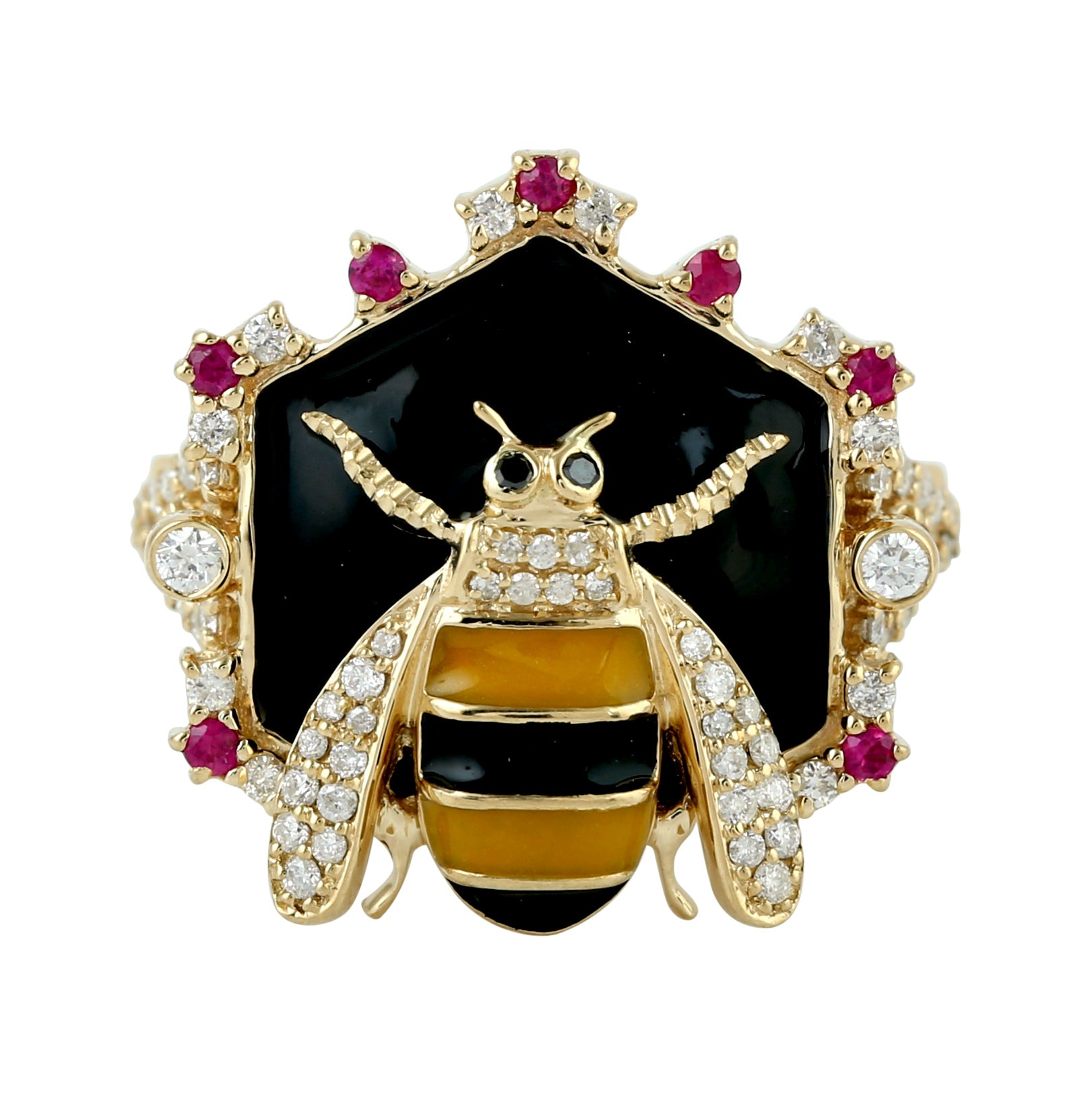 Prong Ruby Gemstone Pave Diamond Honeybee Enamel Ring In 18K Yellow Gold