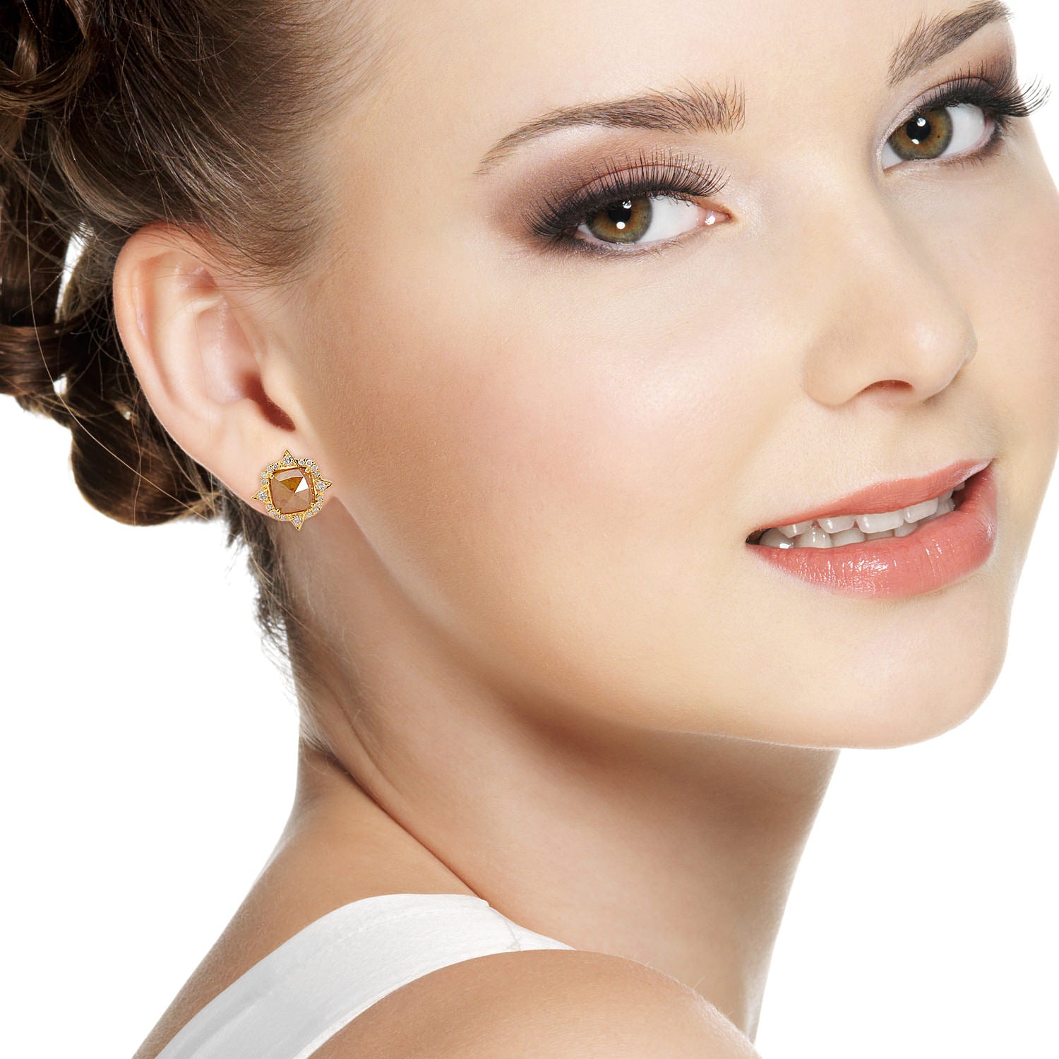 • Rose-Cut Brown Diamond Star Halo Stud Earrings in 18K Yellow Gold