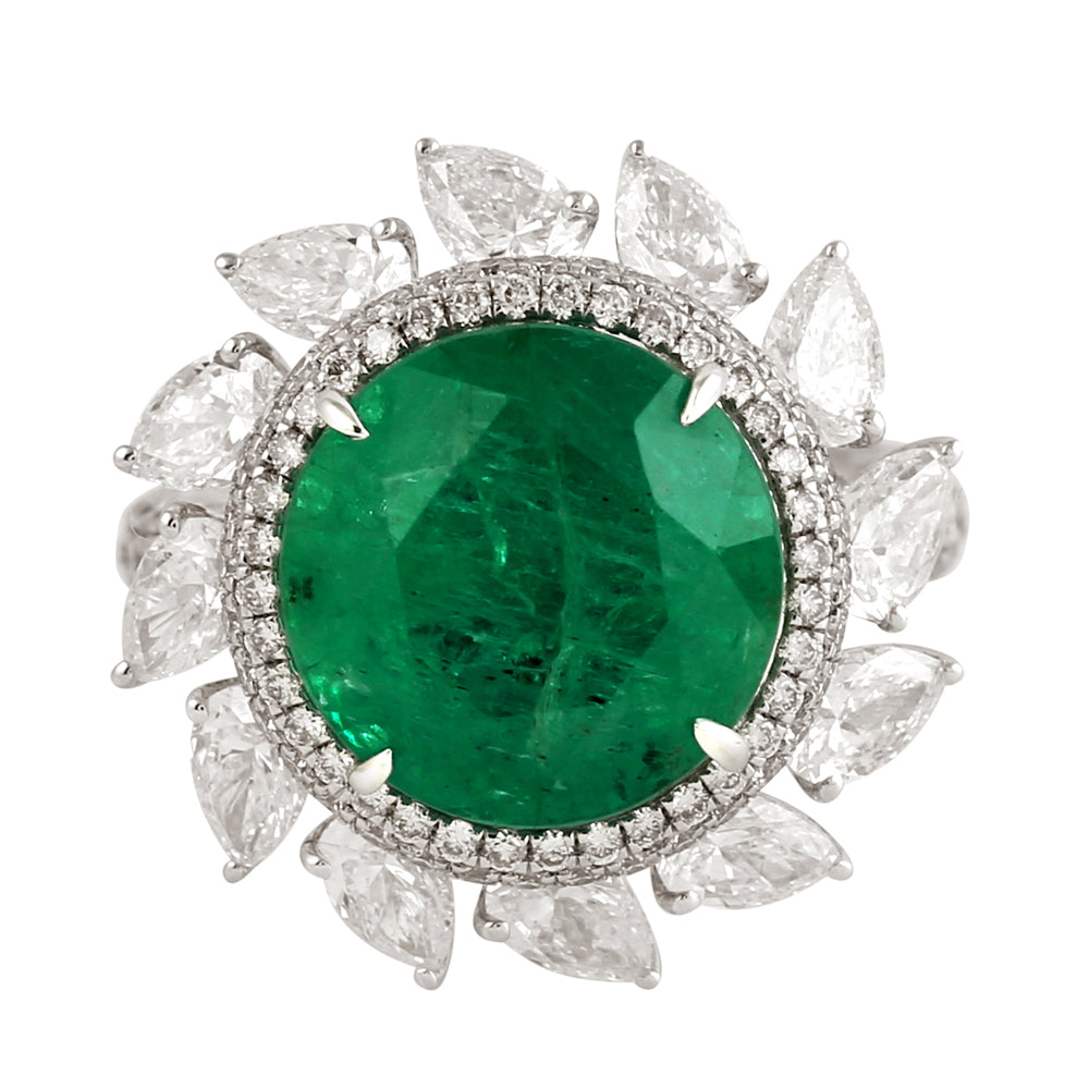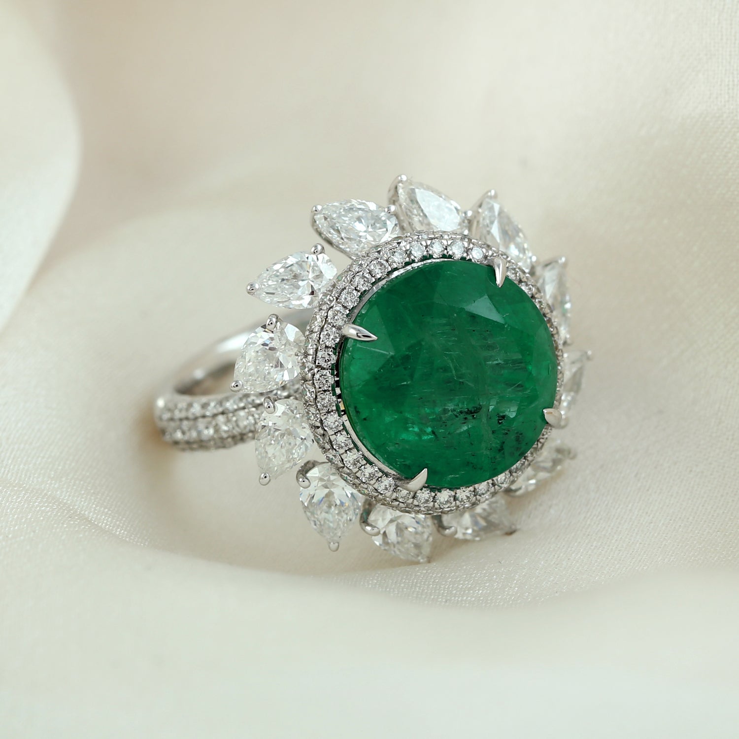 Round Cut Emerald Halo Rose Cut Diamond Cocktail Ring in 18k White Gold