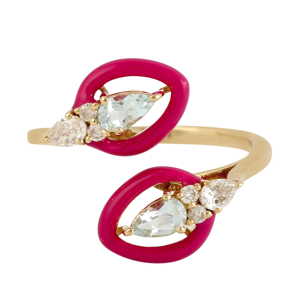 Aquamarine Gemstone Diamond Enamel Bypass Ring In 14k Yellow Gold