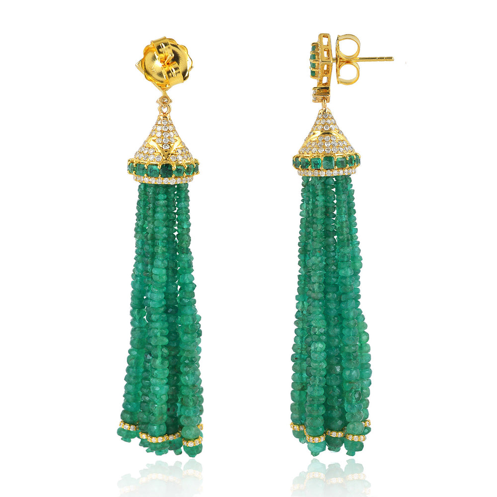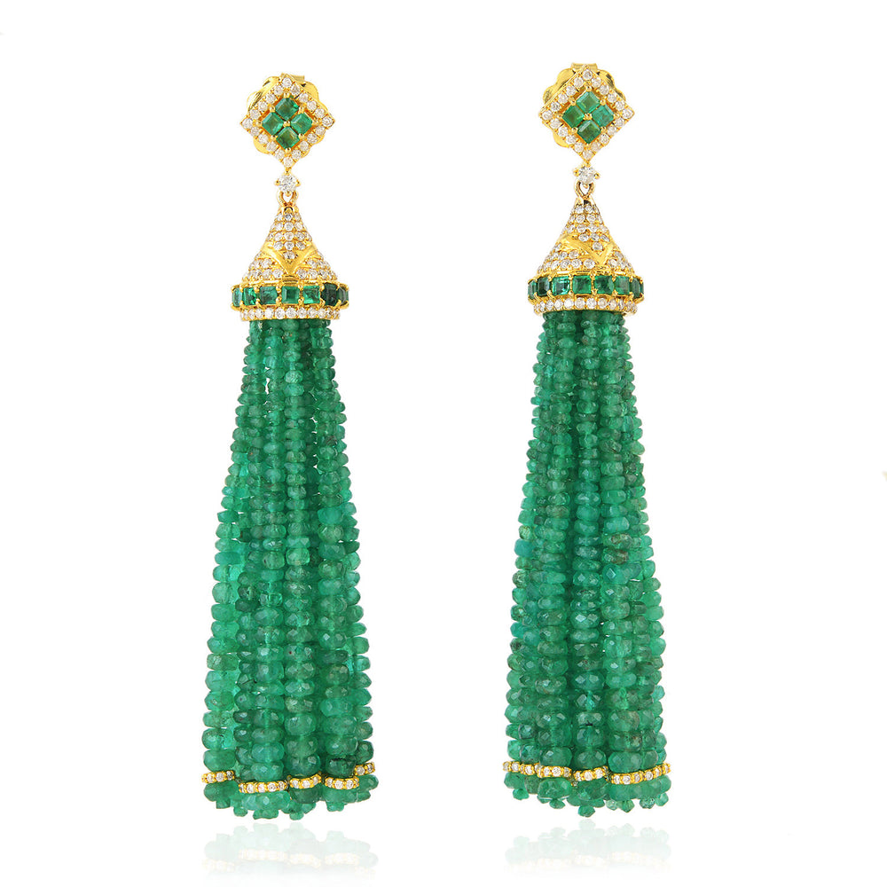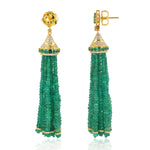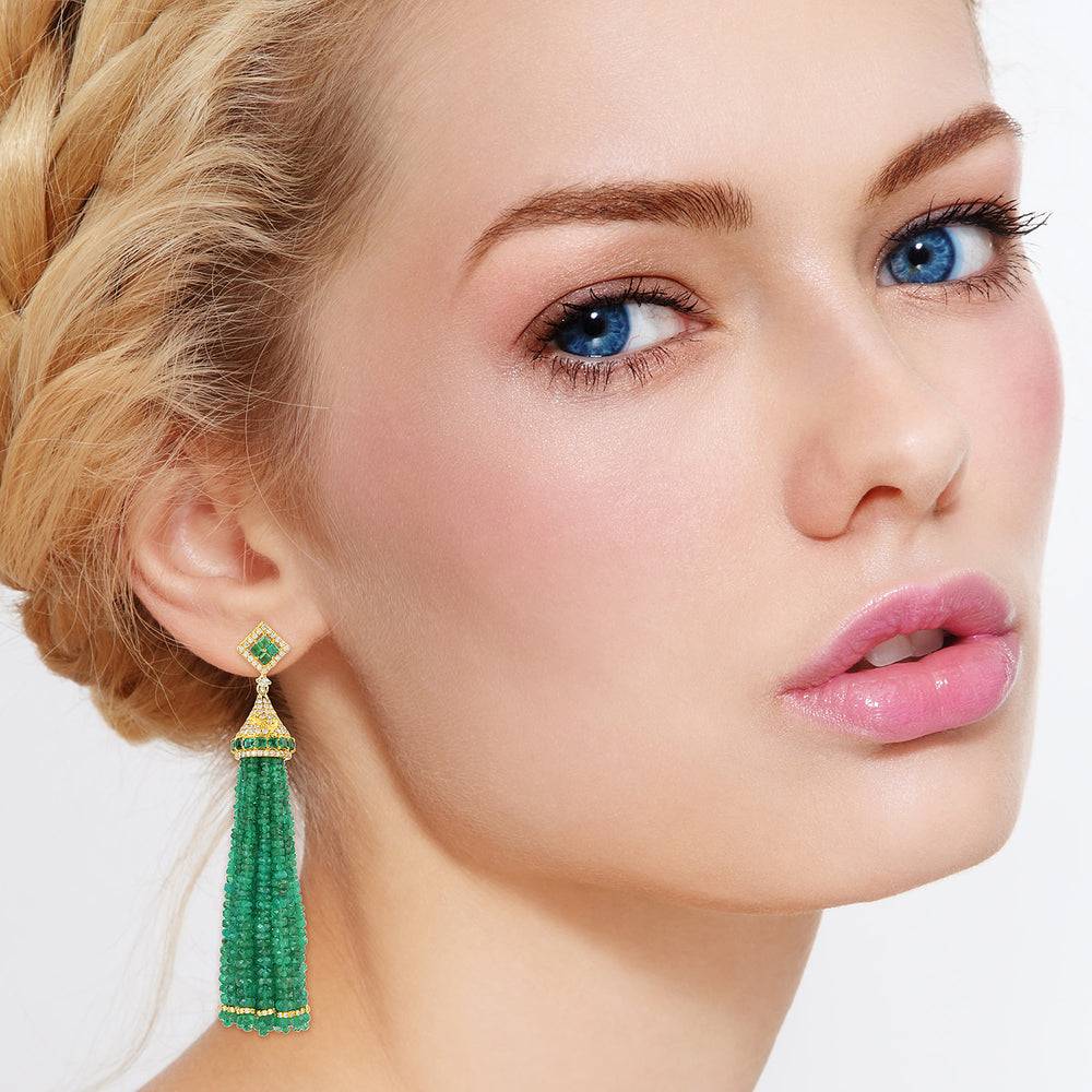 Faceted Emerald Bead Tassel Earrings with Prong Diamonds in Yellow Gold