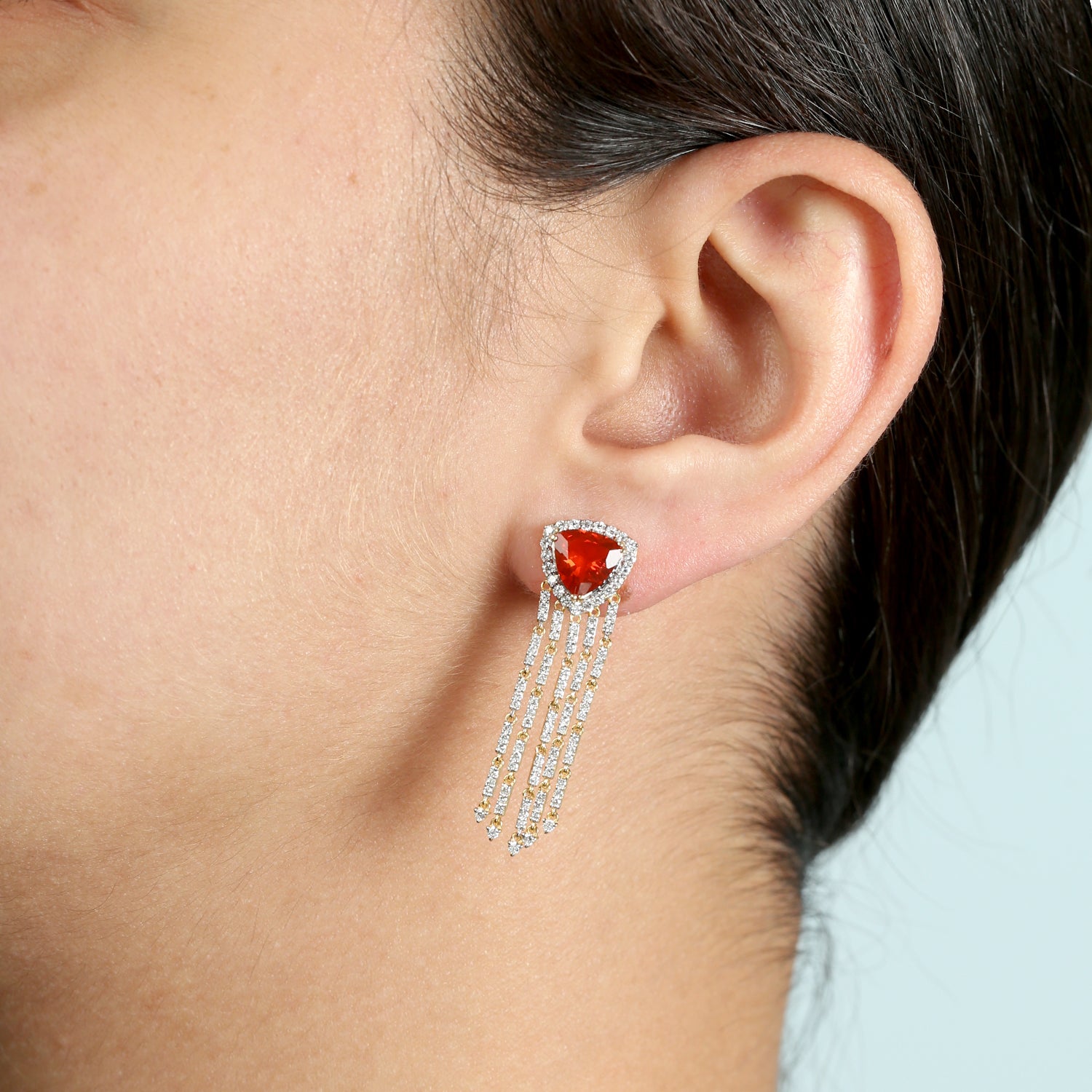 White Gold Chandelier Earrings with Trillion Cut Fire Opal & Pave Diamonds