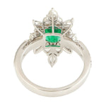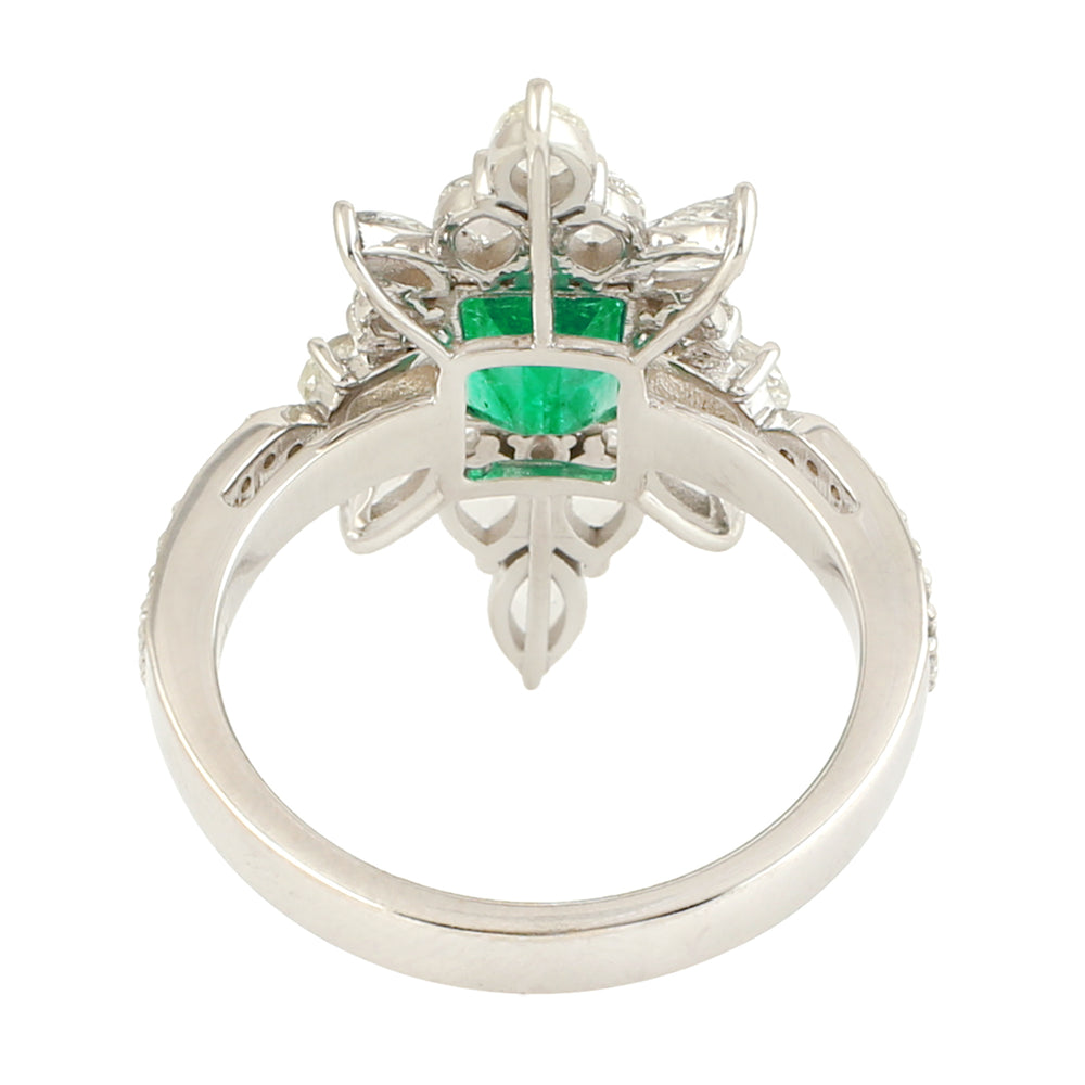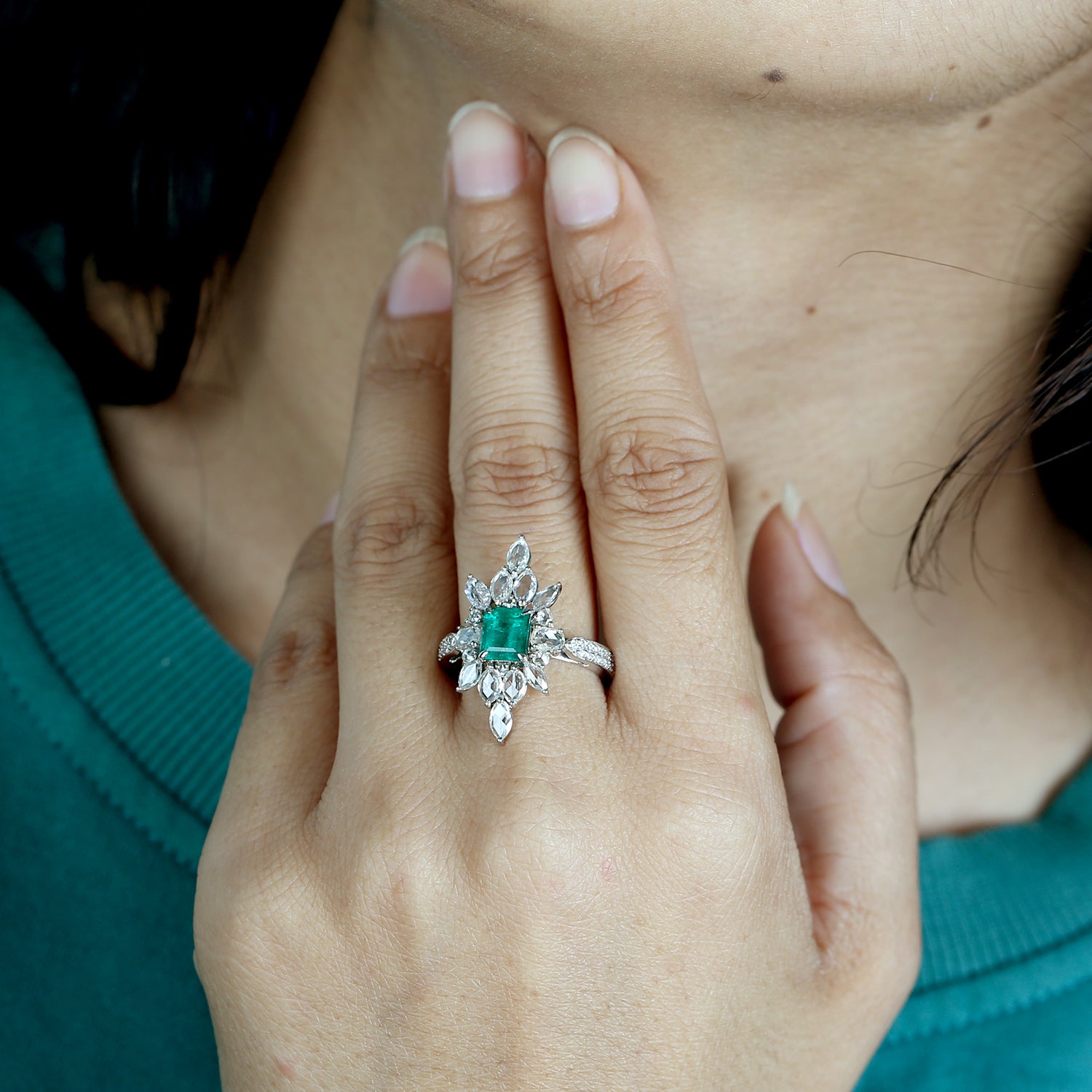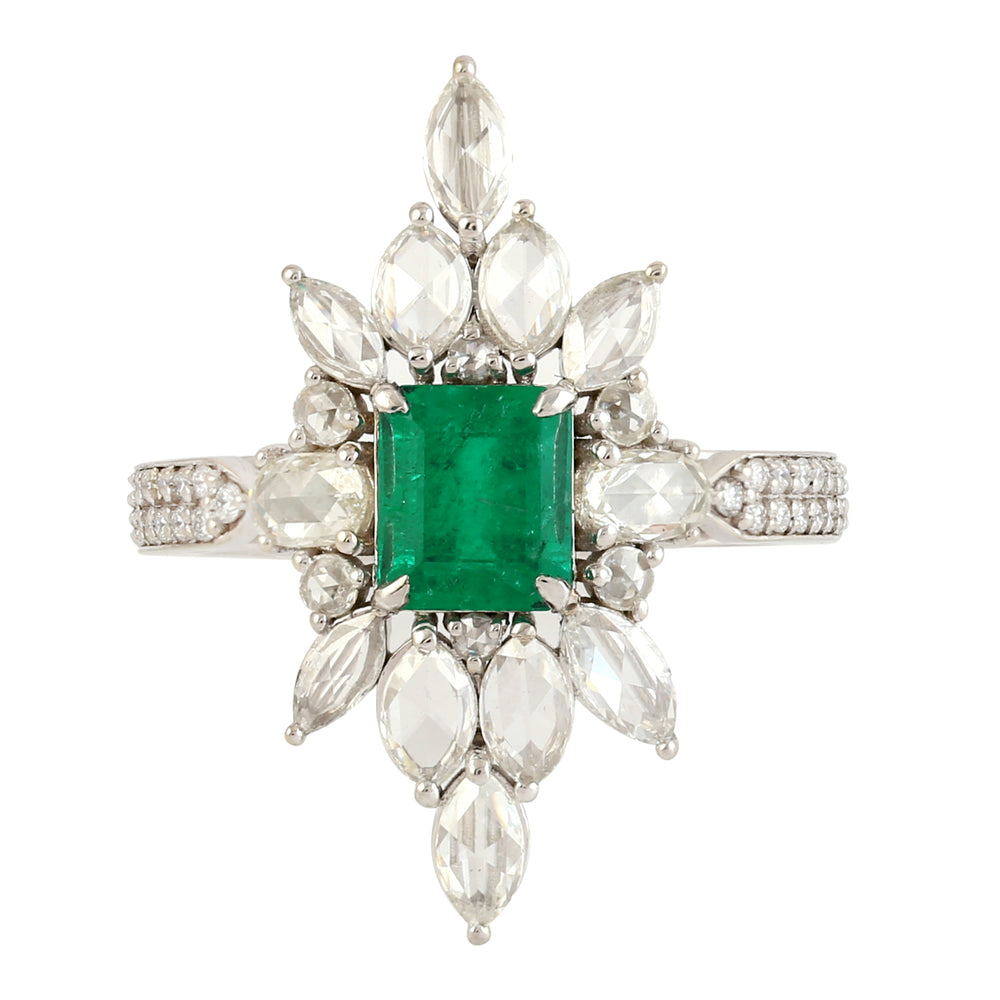 Emerald Gemstone Rose Cut Diamond Long Ring in 18k White Gold