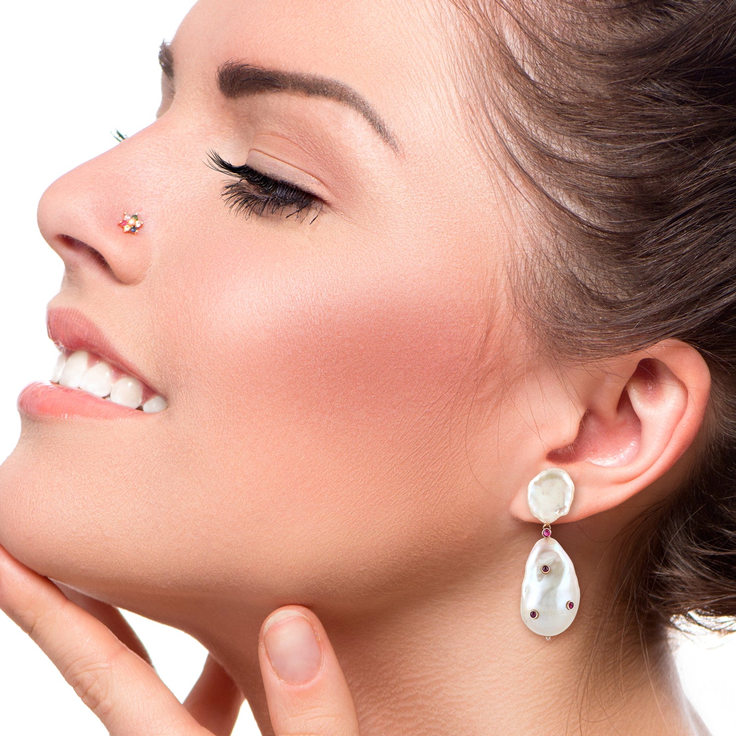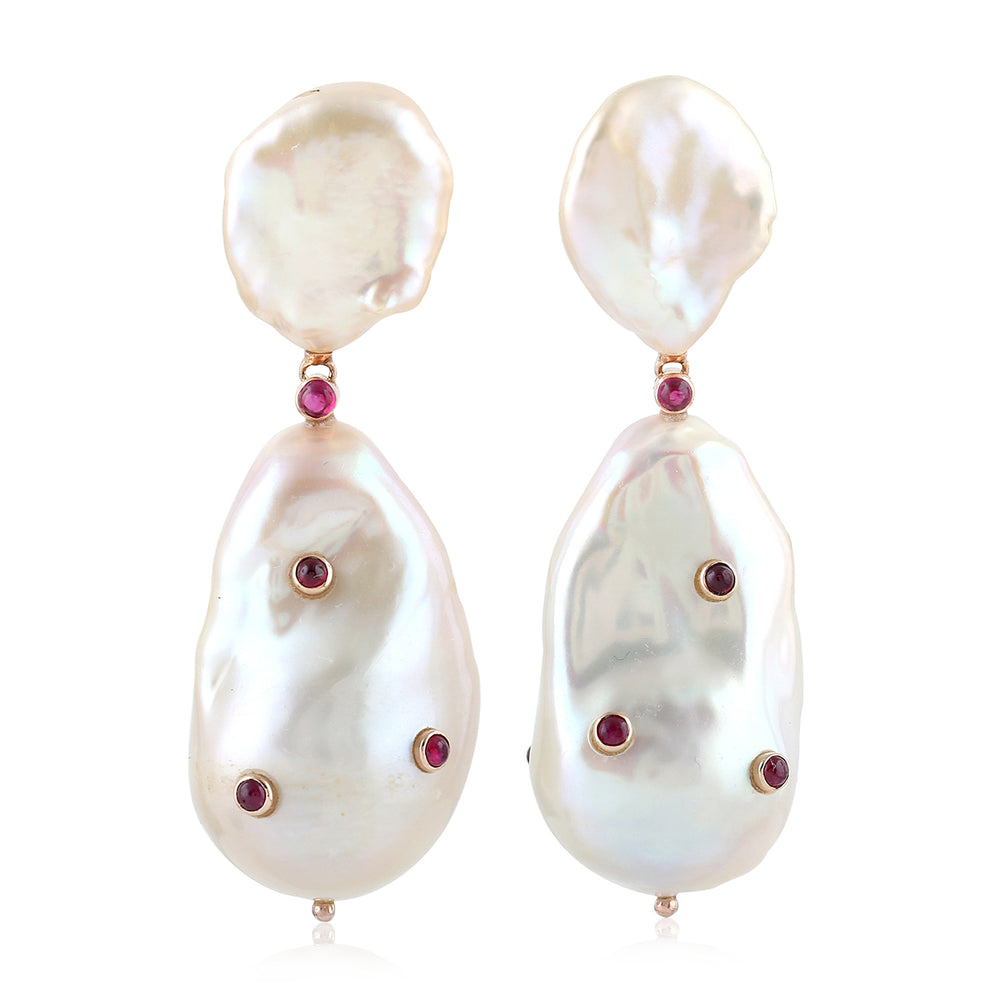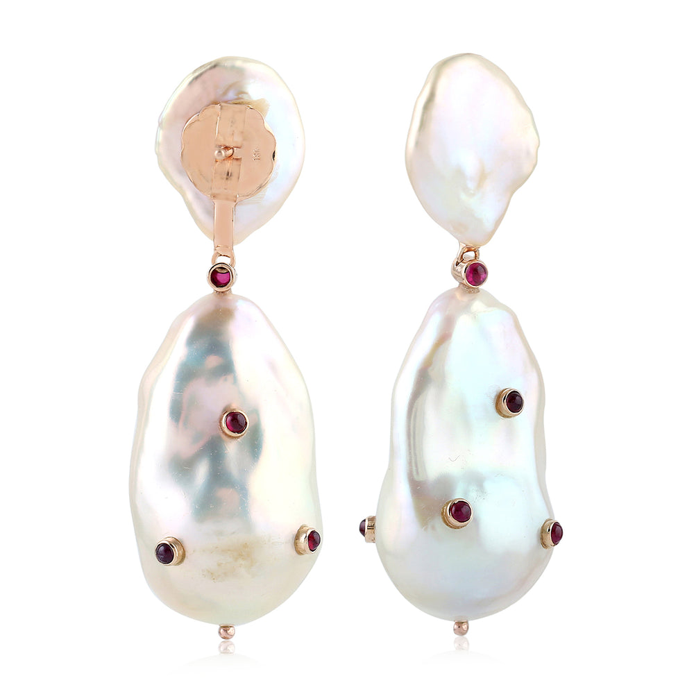Unshaped Pearl Chinese Bezel Ruby Gemstone Dangle Earrings In Rose Gold